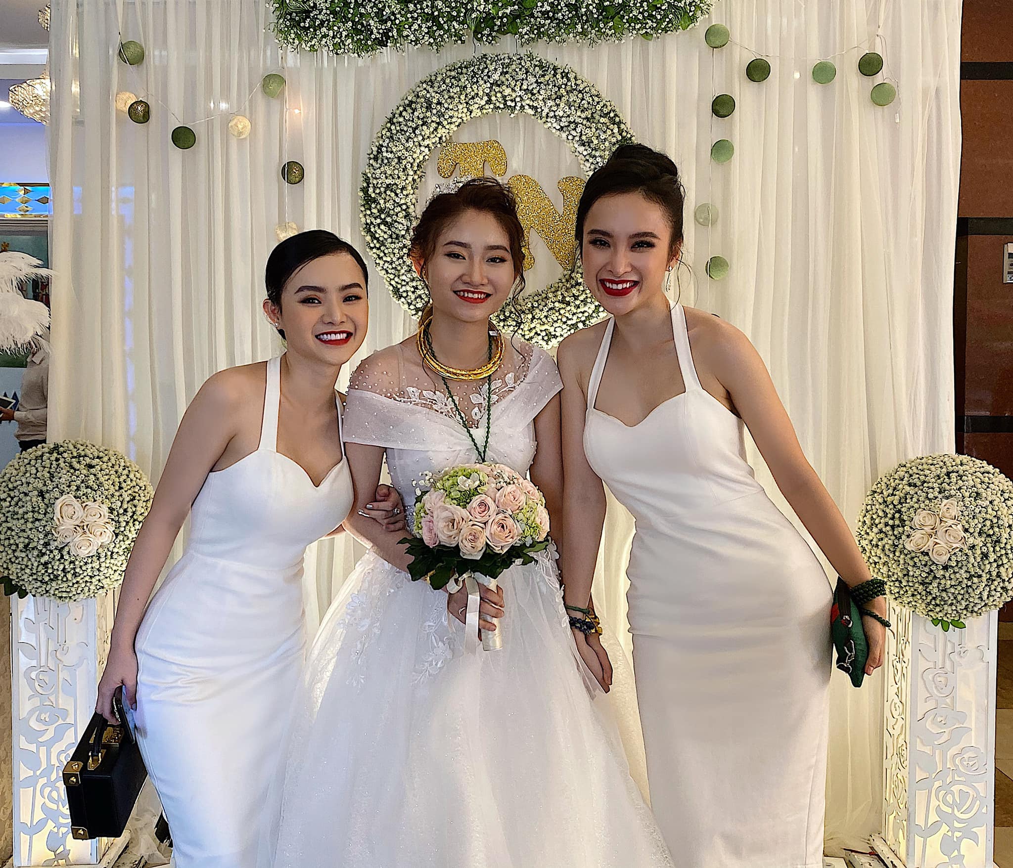 Tại tiệc cưới, cả hai chị em đều đốn tim mọi người với nhan sắc xinh đẹp rạng rỡ cùng lối trang điểm đậm và tóc búi cao, đặc biệt chị em Angela Phương Trinh còn rủ nhau diện đồ đôi khoe vai trần gợi cảm mà ở đây cụ thể là chiếc đầm trắng hai dây có cổ khoét sâu.