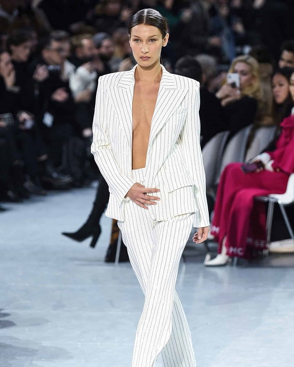 Bella Hadid trình diễn trong show của Alexandre Vauthier tại tuần lễ thời trang Paris diễn ra ở Pháp ngày 21/1 trong bộ suit sọc kẻ không mặc nội y
