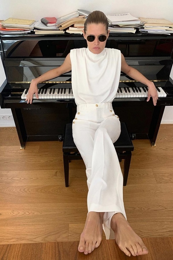Những items basic của Zara như áo cộc tay cùng quần suông ống rộng được người mẫu khoác trên mình tự ngồi chụp hình bên chiếc đàn piano