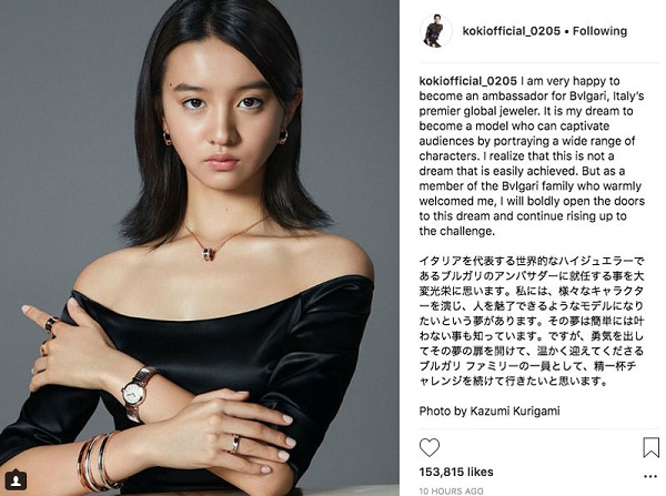 Koki còn trở thành đại sứ trẻ tuổi nhất của thương hiệu đình đám Bvlgari, đây là nhãn hàng mà nữ diễn viên Thư Kỳ làm mẫu đại diện lâu năm cho khu vực Trung Quốc