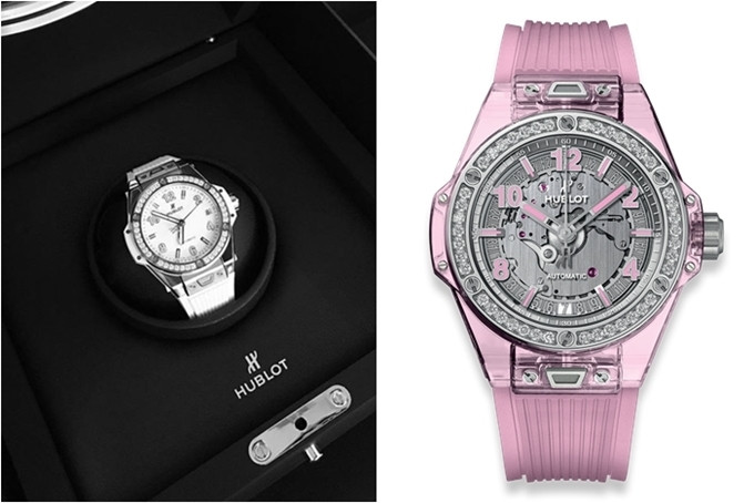 Chiếc đồng hồ Hublot bên trái đính 42 viên kim cương trắng, giá trị tầm 360 triệu đồng. Riêng chiếc bên phải là phiên bản đặc biệt, có giá 1,2 tỷ đồng. Tổng giá trị đợt quà này tiêu tốn của Trinh tầm 4,1 tỷ đồng.