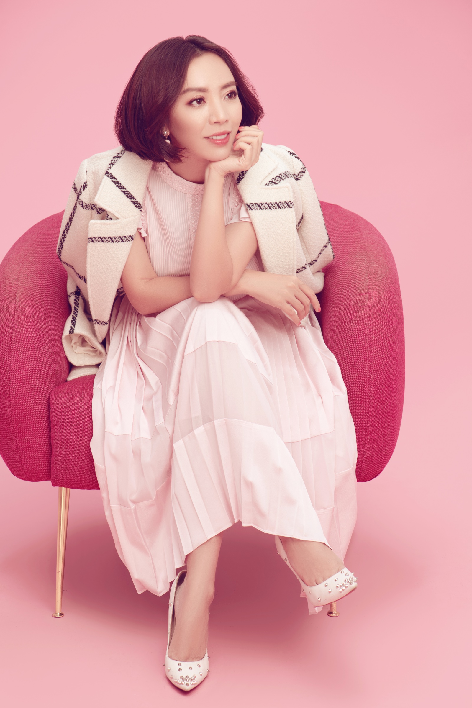 Trong không gian tràn ngập màu hồng, Thu Trang diện loạt trang phục thời thượng và tự tin khoe thần thái sang chảnh.