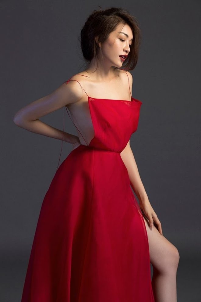 Cũng là một thiết kế áo dài cách điệu, nhưng lần này là trơn màu, cùng không gian huyền bí và cách đánh đèn có chiều sâu, hình ảnh của cô càng thêm bí ẩn.