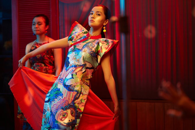 Mẫu áo dài họa tiết với phần tay bồng tạo khối đã từng được NTK trình làng trong BST Mộng Mị.