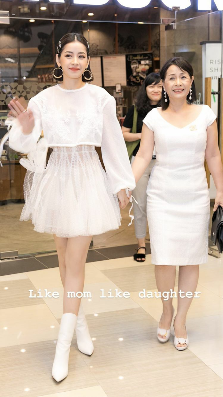 2 mẹ con Chi Pu xuất hiện với trang phục trắng toàn tập vô cùng nổi bật.