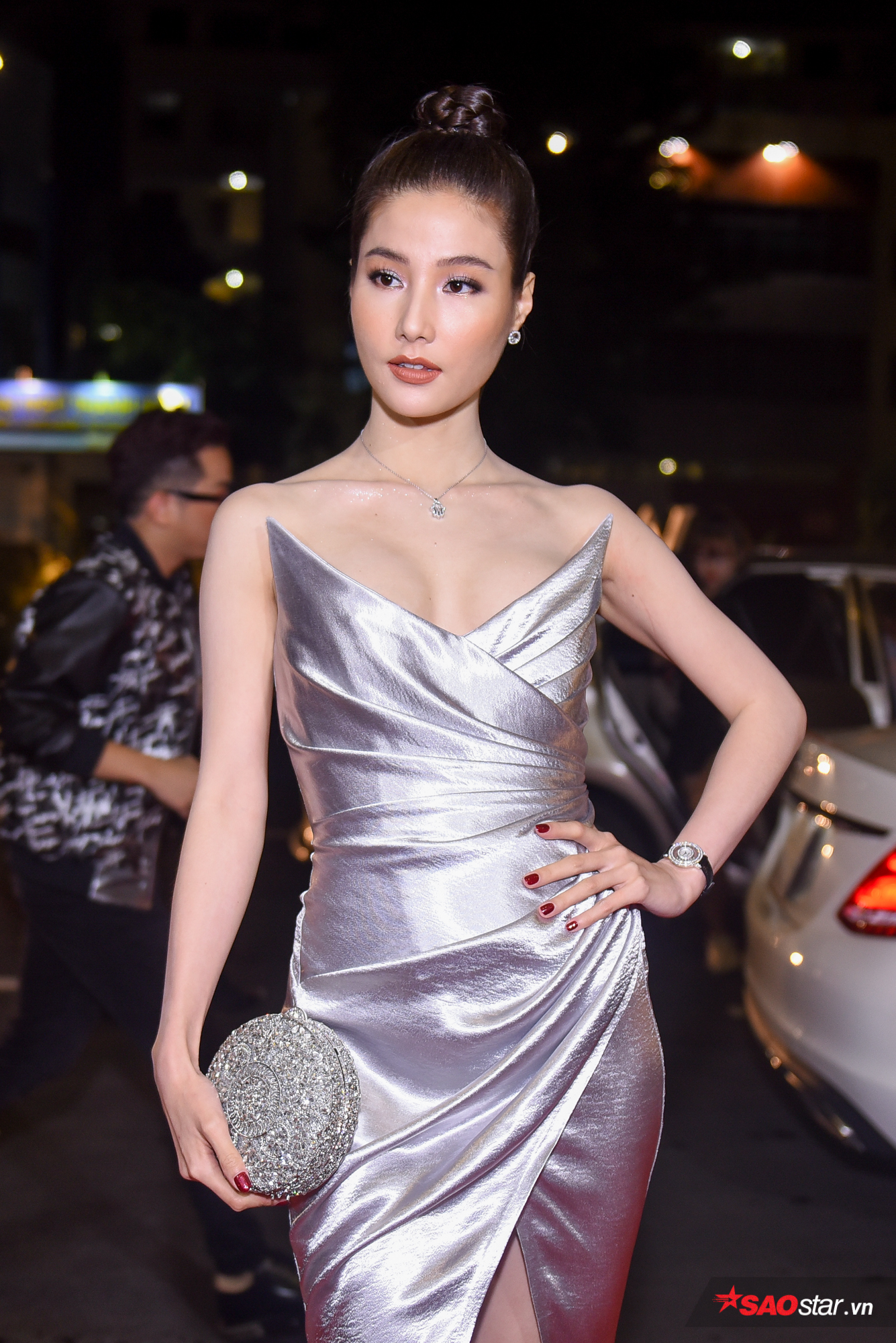 Chiếc váy ánh bạc tưởng không nổi bật nhưng chính chi tiết cúp ngực nhọn đã đem lại sự mới mẻ, thú vị cho Diễm My 9X.