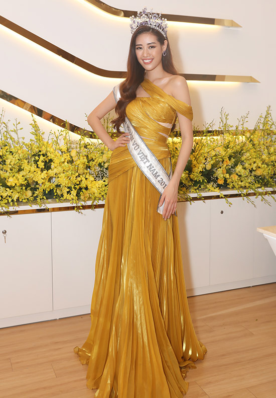 Trở về TP. HCM, tân Hoa hậu gây chú ý khi xuất hiện với chiếc đàm màu vàng nổi bật khi dự sự kiện. Thiết kế “cut out” táo bạo giúp người đẹp sinh năm 1995 khoe được các đường nét trên cơ thể và đôi chân dài miên man.