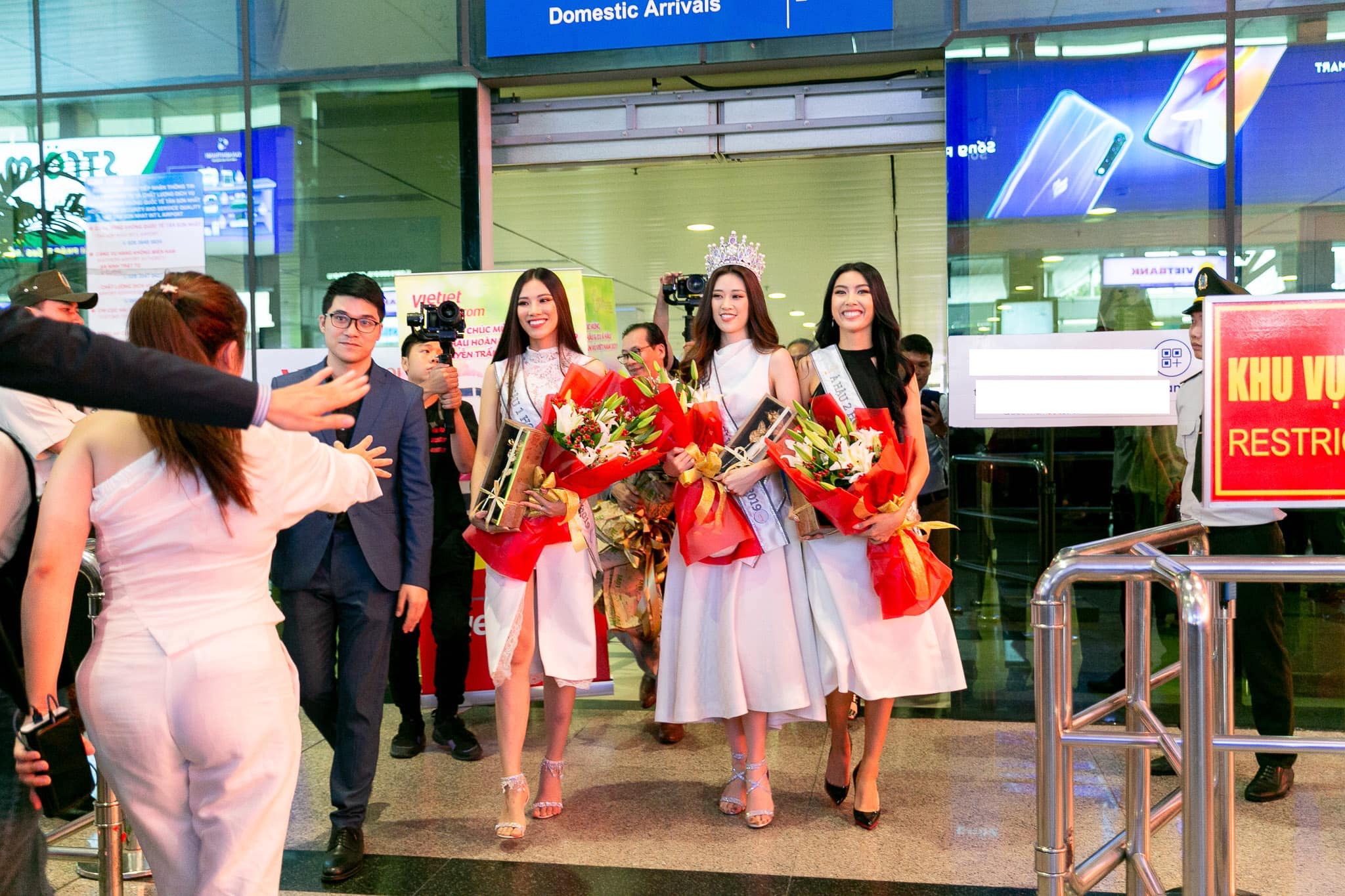 Vừa đăng quang hôm trước, hôm sau tân Hoa hậu đã gây ra màn đụng độ cùng một lúc tới 3 người đẹp khi diện chiếc váy trắng xẻ cao.