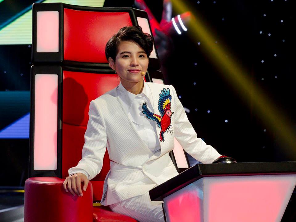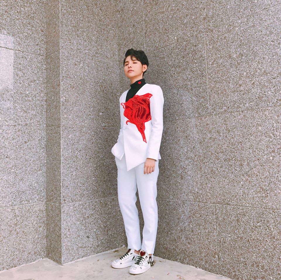 Để mặc vest mãi mà vẫn cứ đẹp như Cát Tường là cả một sự công phu đấy. Nhiều bộ vest của Cát Tường gây ấn tượng mạnh với khán giả bởi nó rất độc đáo, ví dụ như bộ vest trắng thêu hoa nổi bật này.
