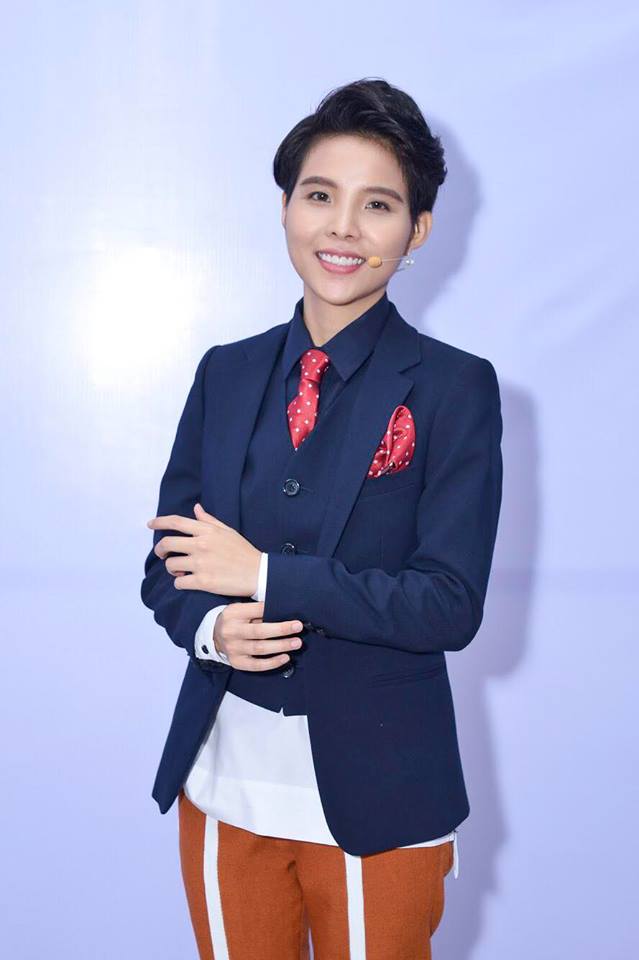 Cát Tường trung thành với kiểu đầu cắt cao gọn gàng, để một chút mái bồng bềnh, lịch lãm cho hợp với những bộ vest của cô nàng.