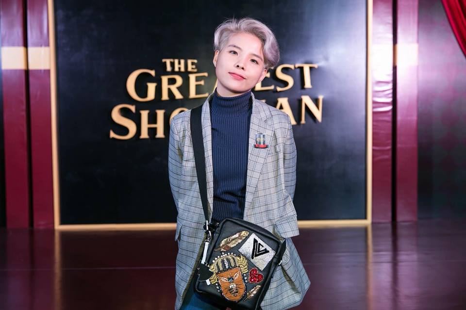 Kết hợp áo thun tăm màu đen với vest xanh nước biển, Cát Tường vừa trẻ trung nhưng cũng không kém phần lịch lãm.