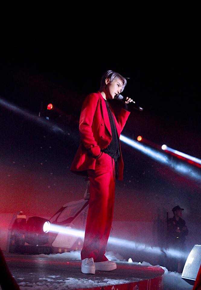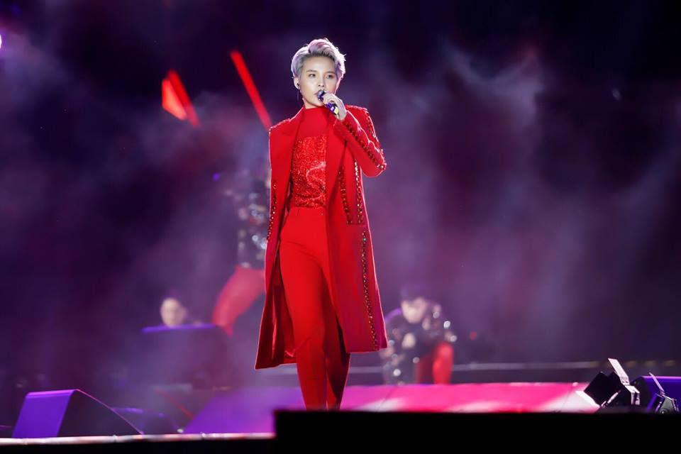 Trong một lần biểu diễn khác, Cát Tường vẫn tận dụng chiếc áo vest yêu thích, kết hợp với quần đen là thành một bộ đồ mới bắt mắt.