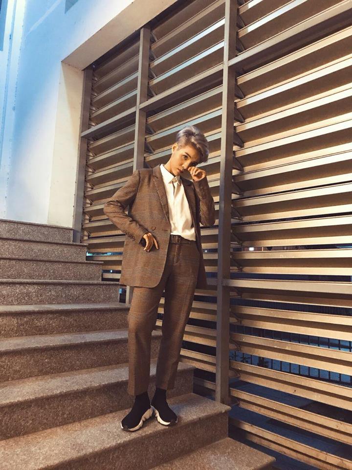 Và tất nhiên là trong tủ đồ của Cát Tường không thể thiếu được vest kẻ lịch lãm. Nhìn Cát Tường bảnh bao chẳng kém anh chàng nào khi diện bộ vest này.
