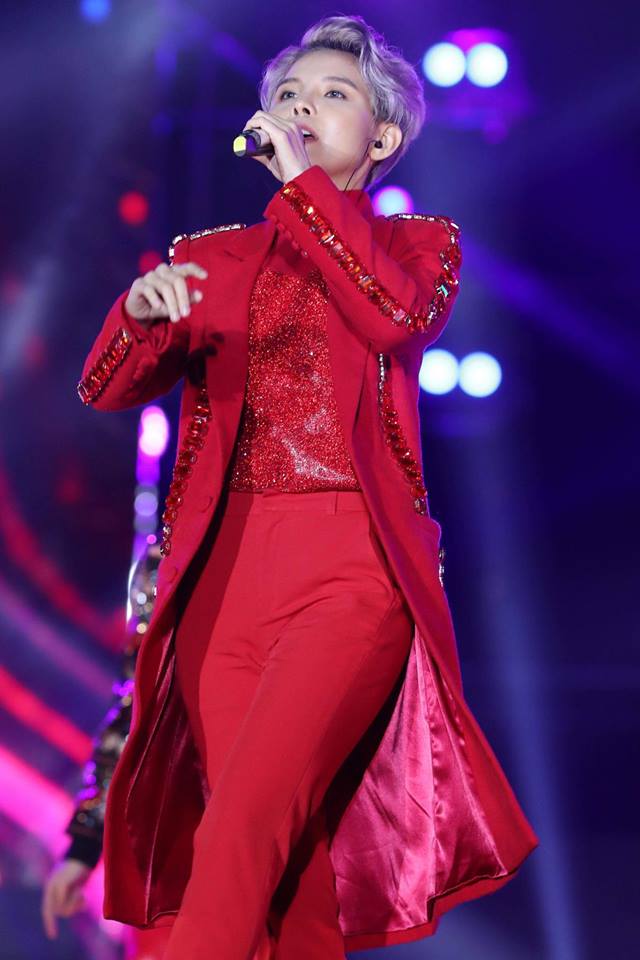Kết hợp với sơ mi xếp ly ở bên trong, Cát Tường đã có bộ đồ biểu diễn sân khấu rất đẹp mắt.