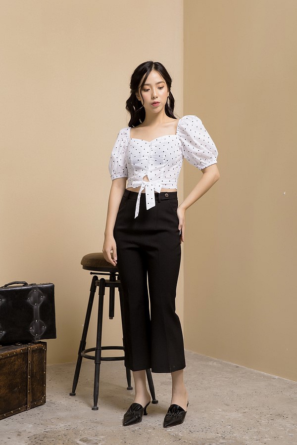 Hay là họa tiết chấm bi với kiểu thiết kế buộc dây phần dưới áo giúp cho các nàng tôn lên được vòng eo thon gọn của mình. Chẳng những thế lại trông còn rất lịch sự, sang trọng khi đi đôi cùng chiếc quần tây công sở.
