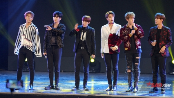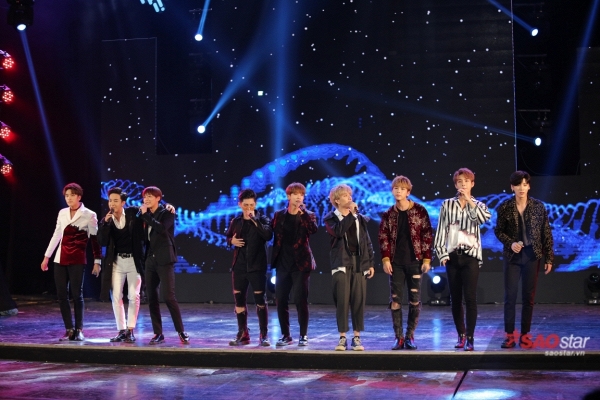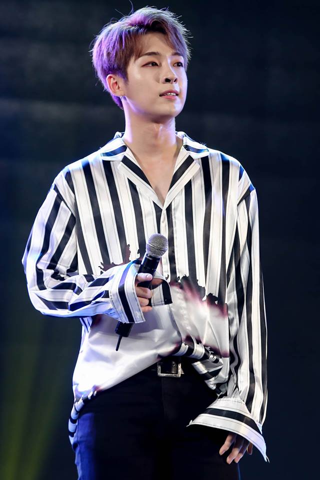 Anh chàng của nhóm nhạc Hàn nổi bật trong thiết kế áo sơ mi họa tiết cháy loang bắt mắt khi có màn kết hợp cùng nhóm nhạc MONSTAR.