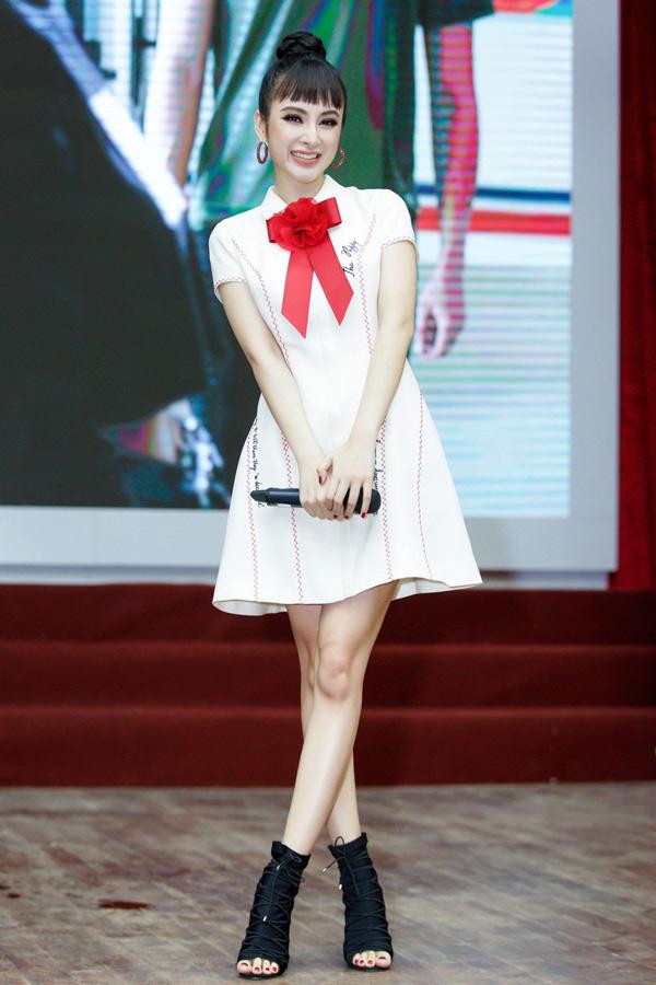 Angela Phương Trinh luôn biết cách khiến cô trở nên nổi bật, ấn tượng hơn với tóc búi cao, boot hở mũi sành điệu. Người đẹp 9X tạo điểm nhấn bằng mái ngố để tăng thêm sự khác lạ.