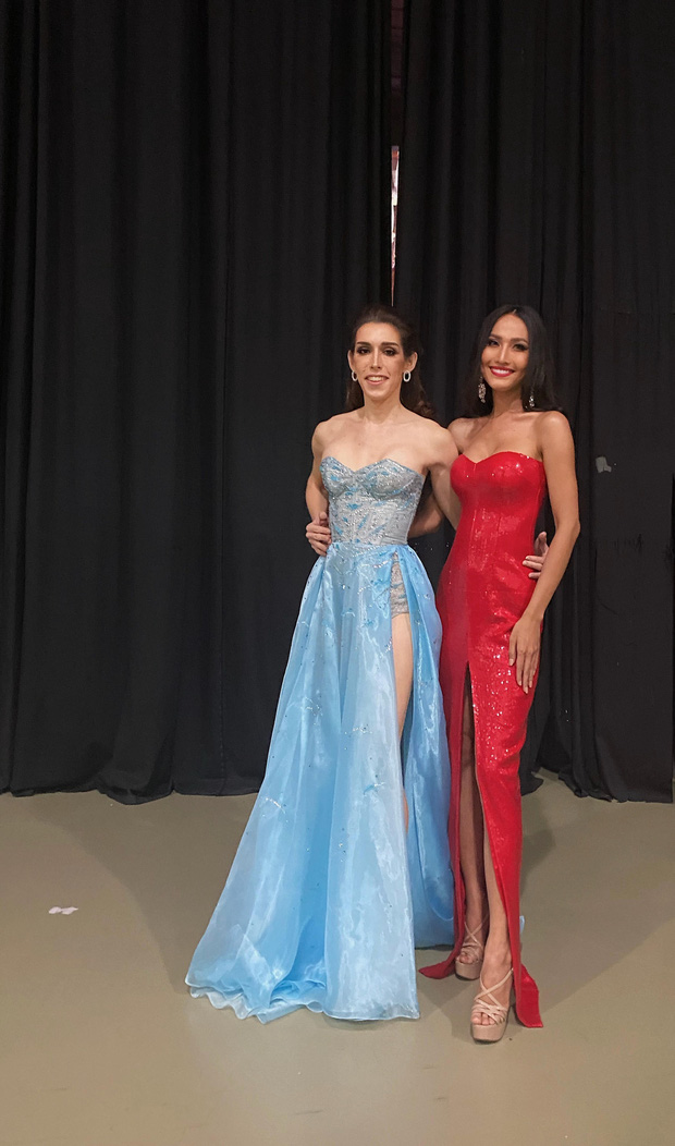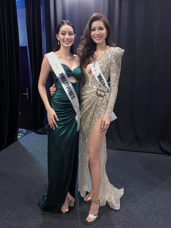 Đôi bạn cùng tiến ở Miss Universe trong cùng một thiết kế.