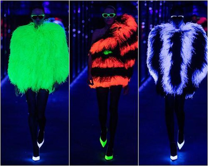 Không gian sân khấu tối đen để làm bật lên các thiết kế phản quang neon đặc sắc trong các thiết kế đến từ nhà mốt Pháp.
