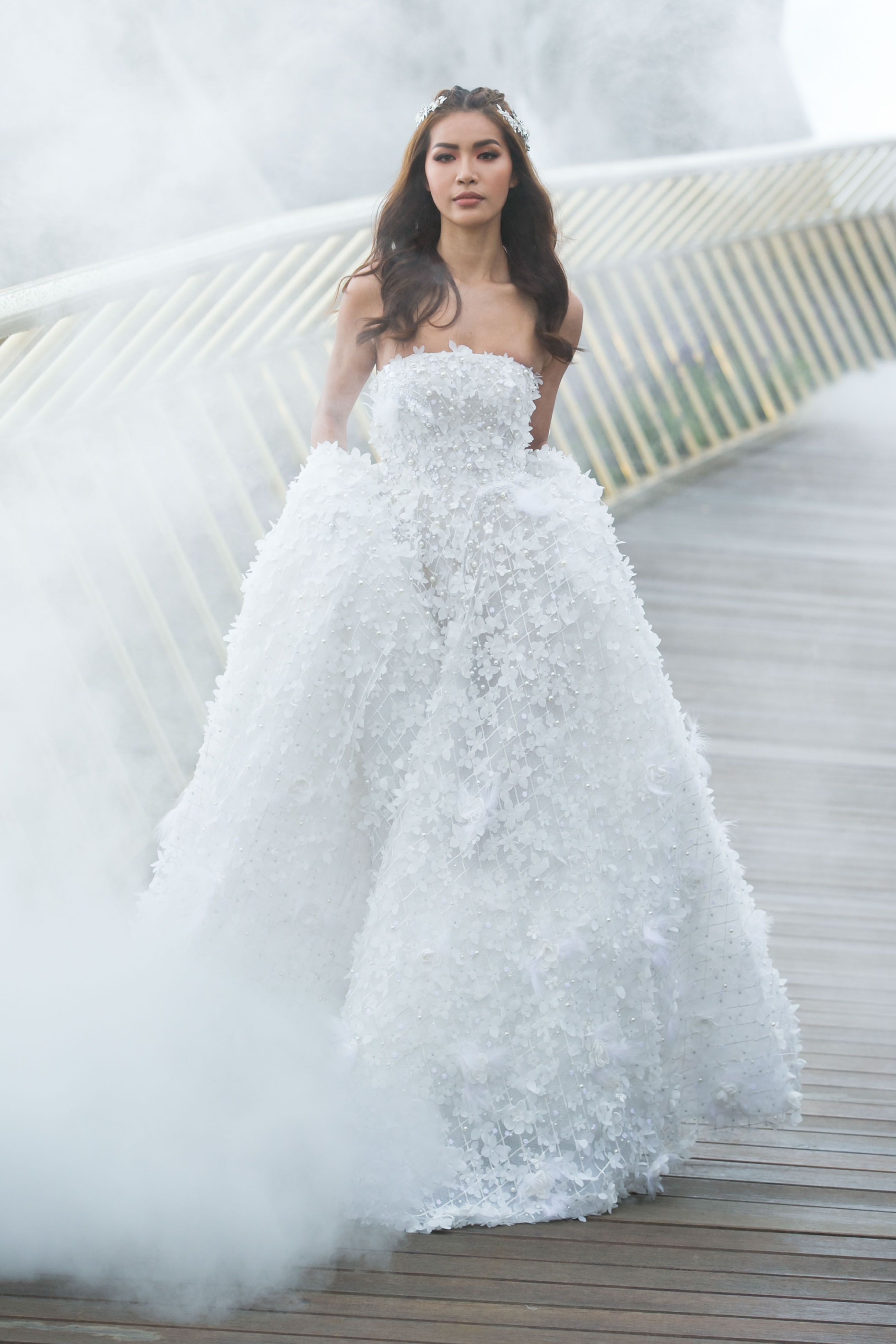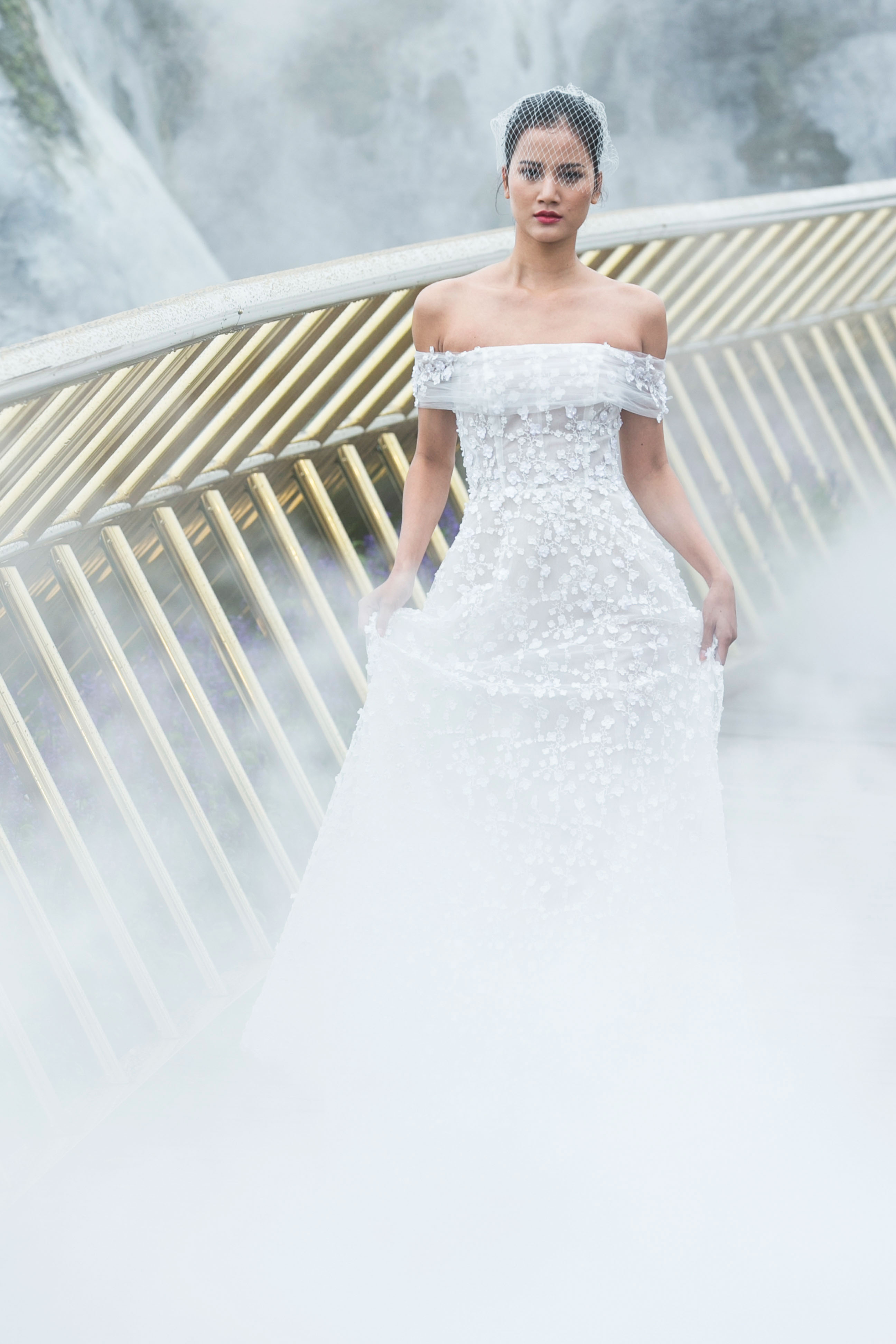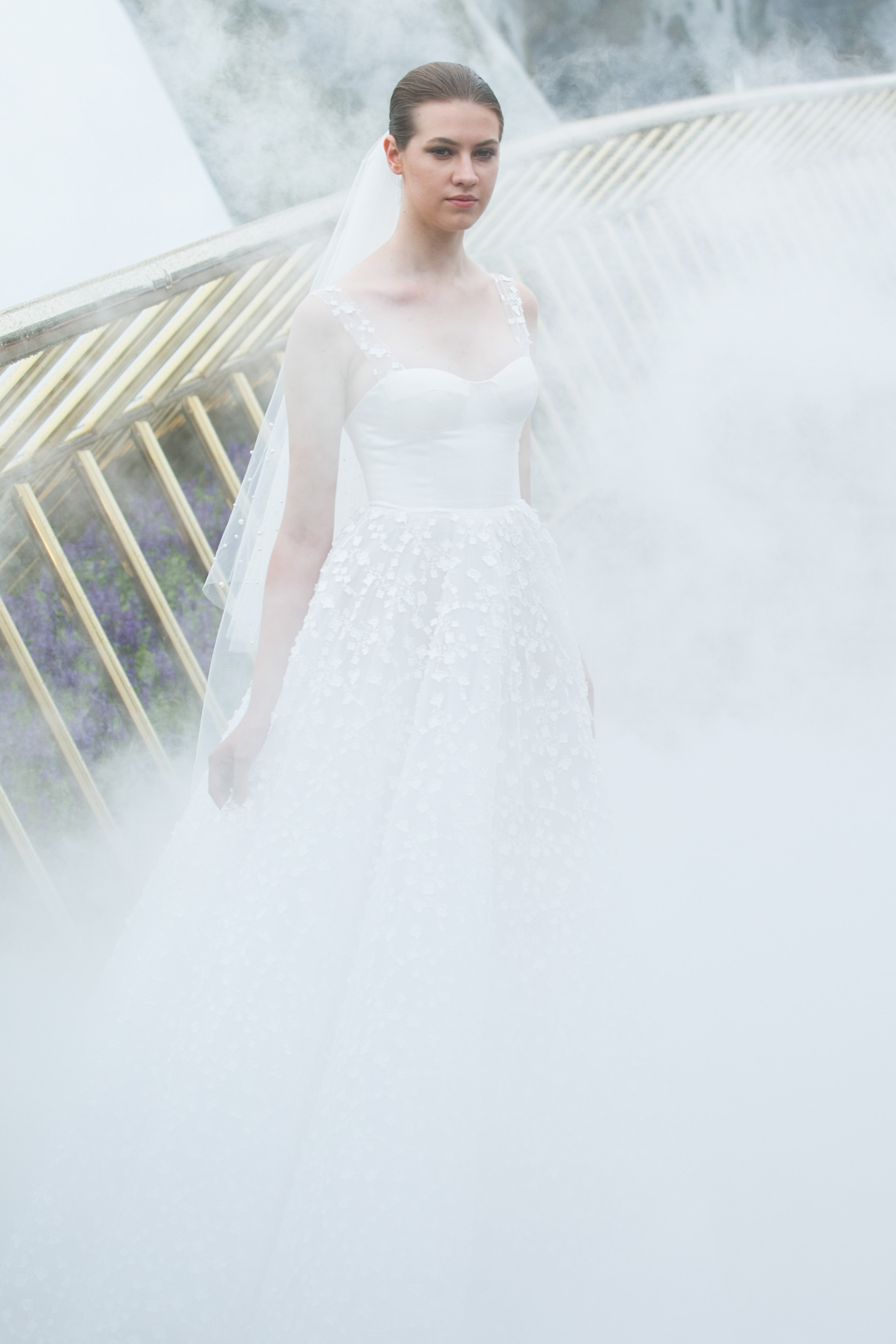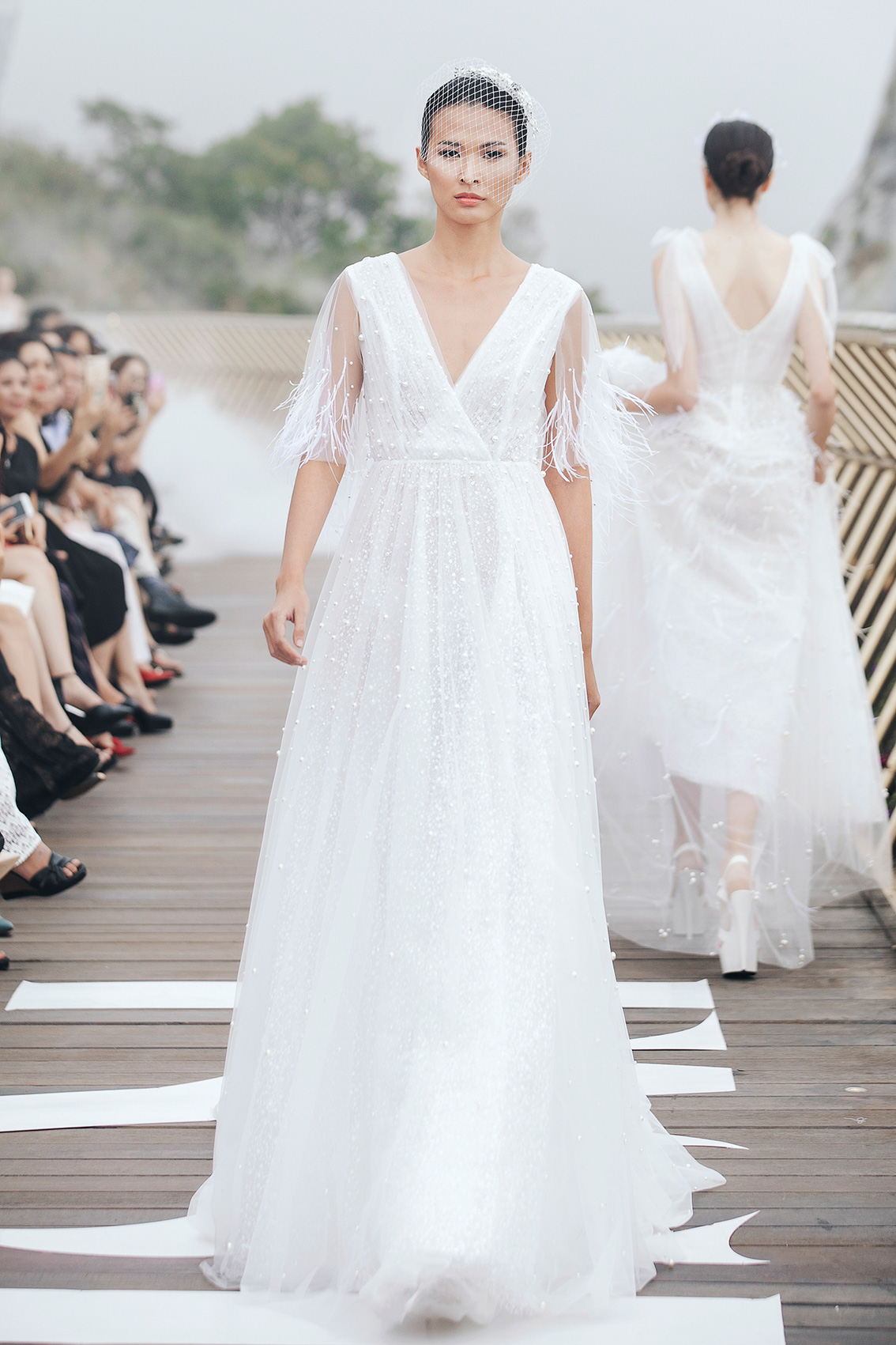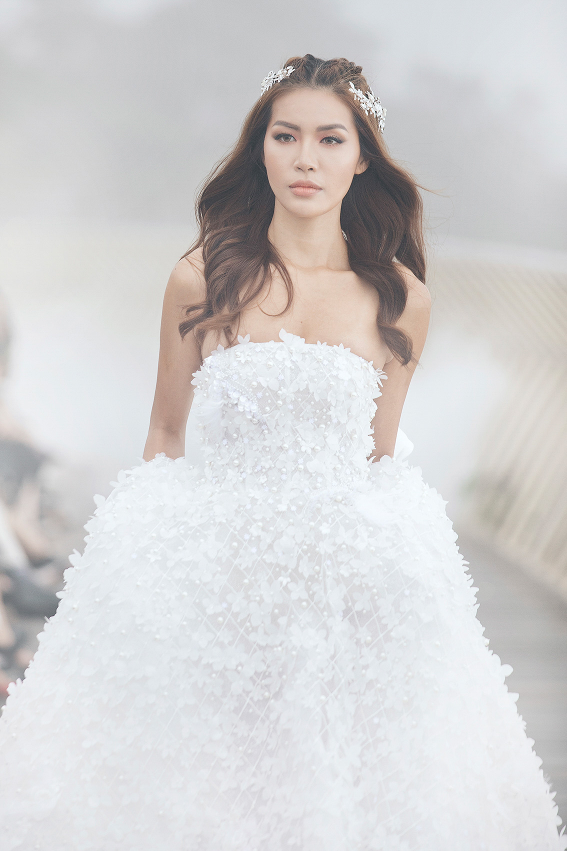 Hàng trăm ngàn những bông hoa vải 3D cùng hoạ tiết đám mây, hoa lá và những cánh chim trời xuất hiện xuyên suốt trong BST lấy cảm hứng bắt nguồn từ câu chuyện tình của Mây - Gió - Mưa.