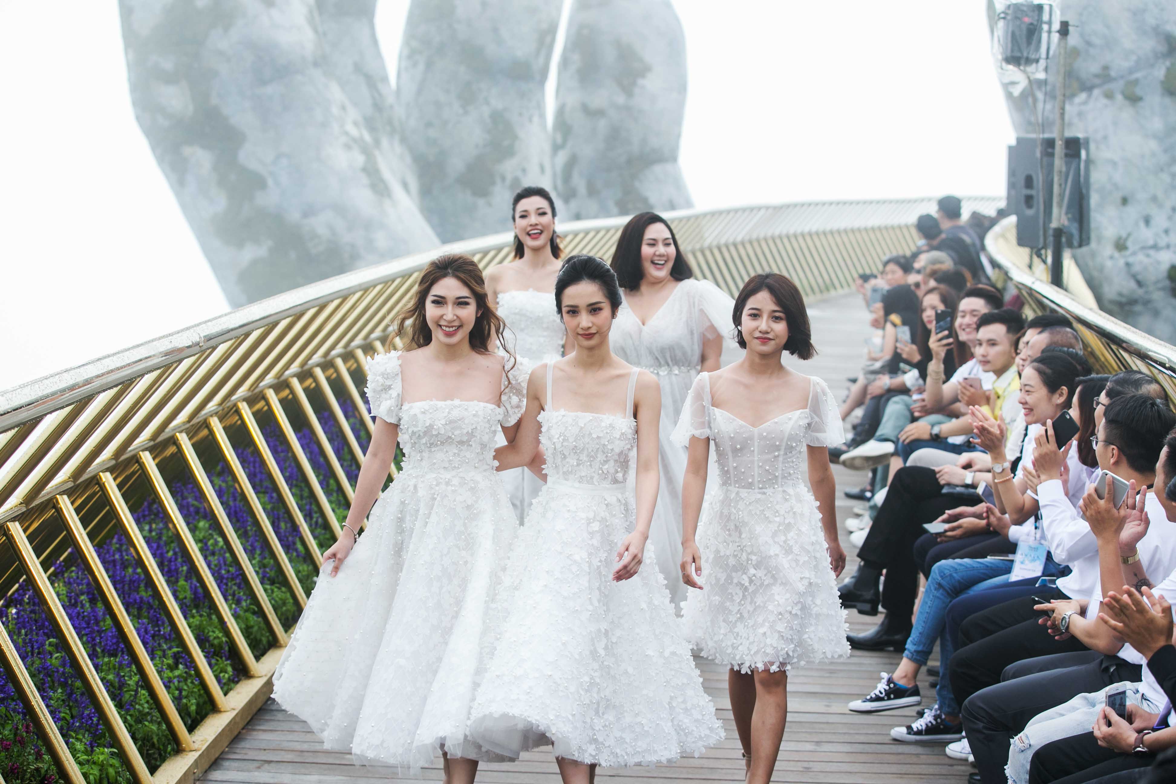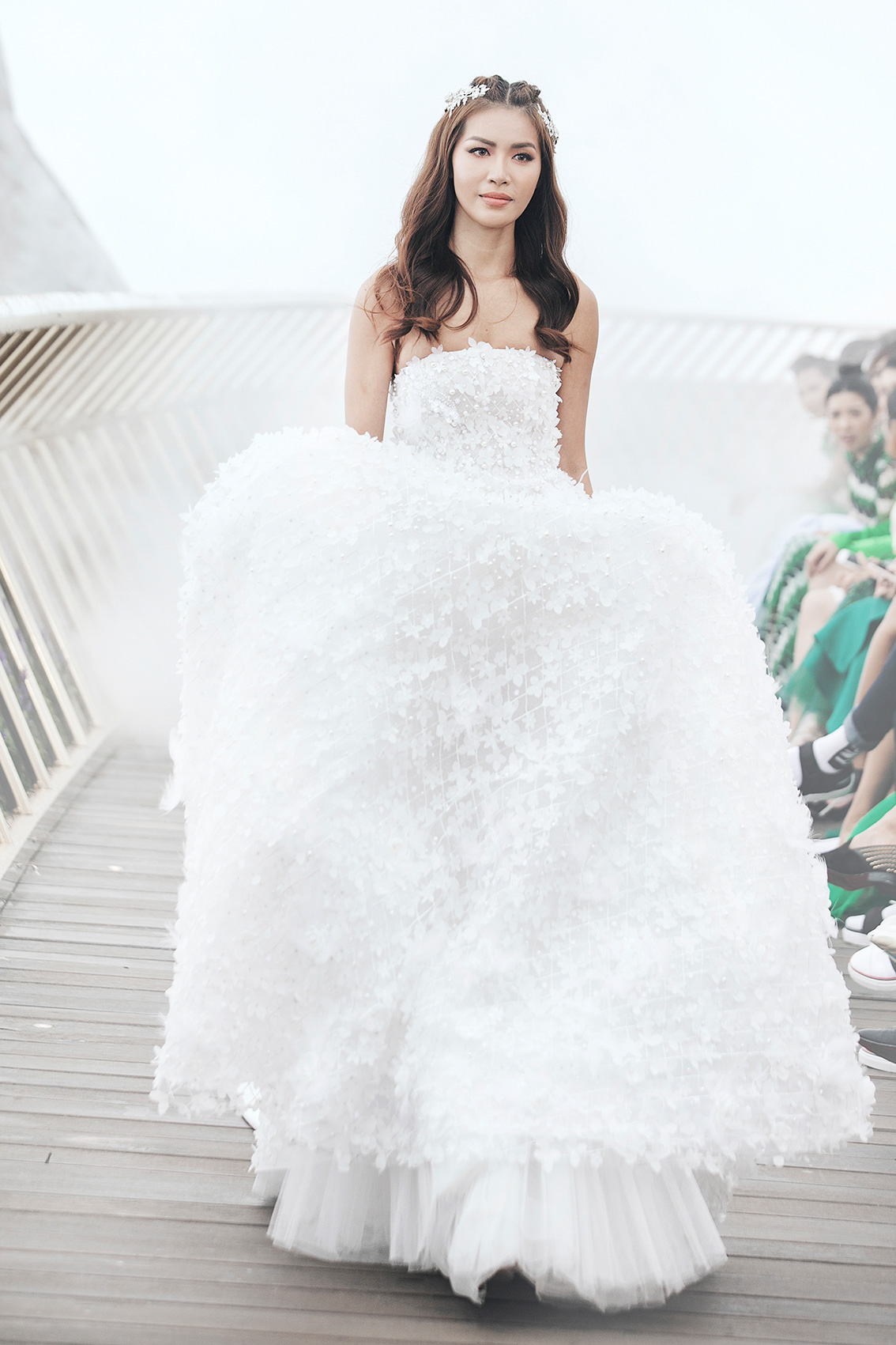 Xuất hiện trong một show diễn gần đây mang tên “Nàng Mây”, Minh Tú đã “bỏ bùa” người hâm mộ khi hóa thân thành một cô dâu rạng rỡ. Khoác lên mình chiếc váy cưới được đính kết 50.000 cánh hoa, chân dài sải những bước khoan thai, thong thả dạo chơi trên cây cầu Vàng cao hơn 1.400m so với mực nước biển.