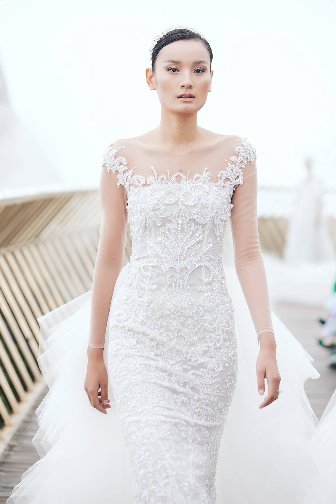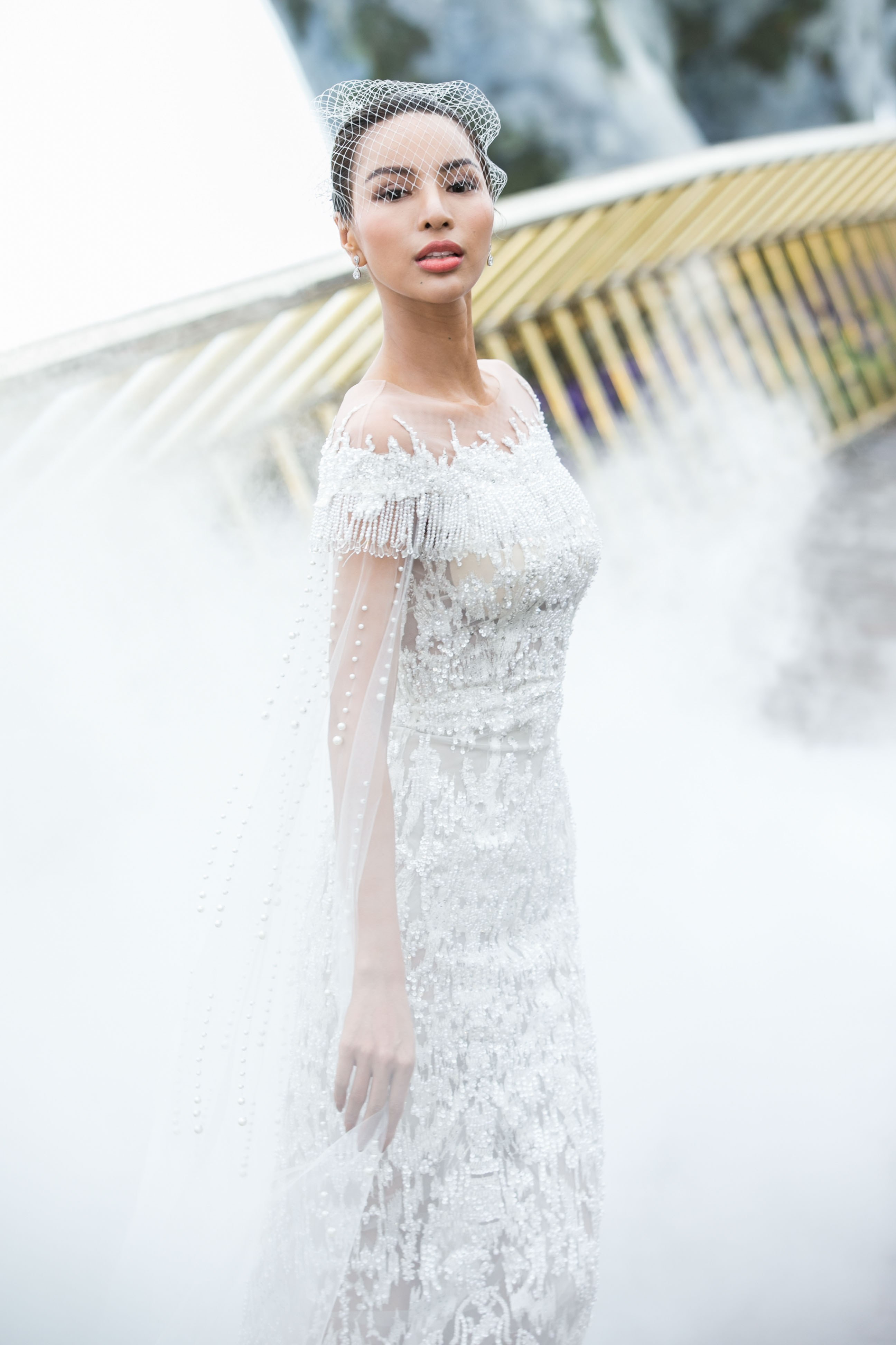 Xuất hiện với vị trí vedette, Minh Tú không khiến người hâm mộ thất vọng với hình ảnh cô dâu e ấp, nhẹ nhàng nhưng cực kỳ quyến rũ.