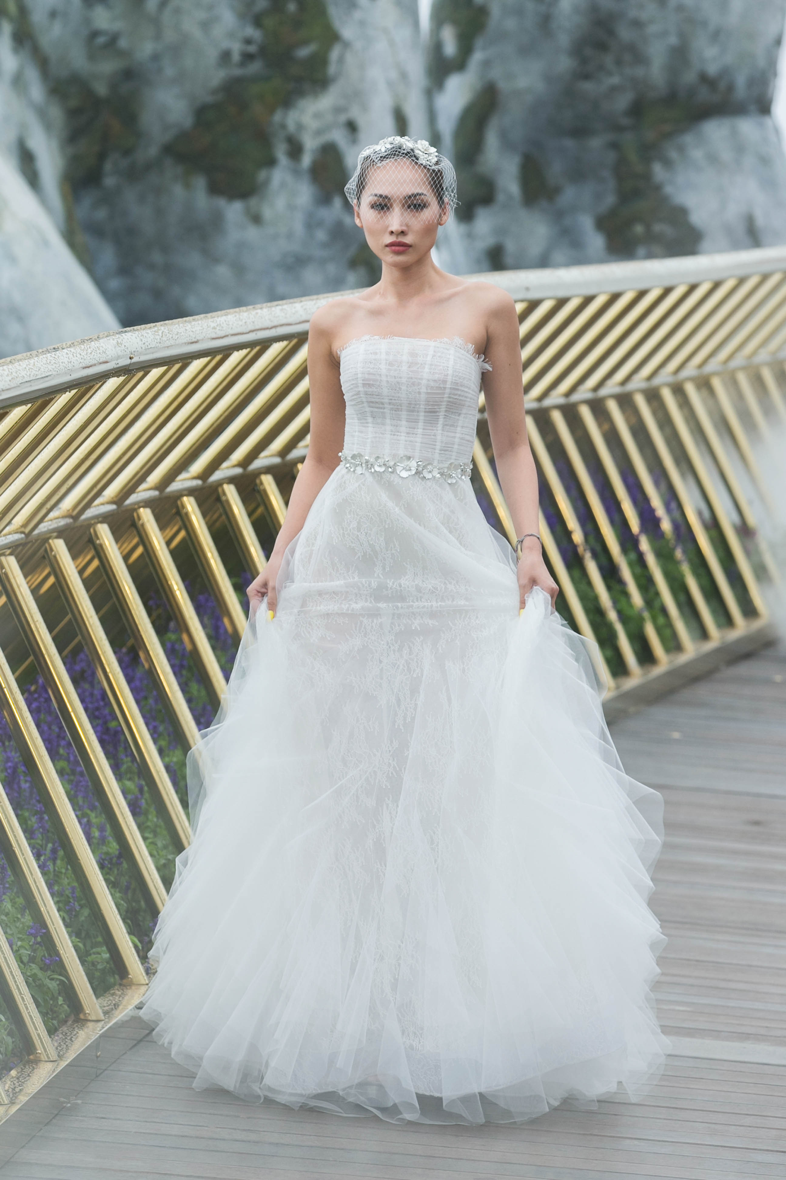 Sự tài hoa của NTK thể hiện trong việc cắt và phối hợp layer các lớp ren và lưới với sự khác nhau về bề mặt hoạ tiết nhưng vẫn hài hoà, tạo nên một tổng thể hài hoà đẹp mắt.
