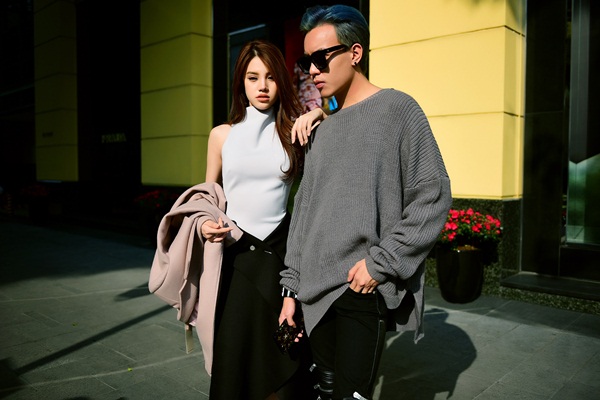 Mạch Huy vẫn cố níu kéo một chút “gia vị” của thời trang thu đông khi chọn áo len dệt kim sánh đôi cùng hoa hậu người Việt tại Úc Jolie Nguyễn.