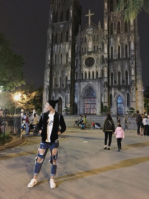 Ở đầu cầu Hà Nội, stylist Lê Bảo Trung chọn jean rách te tua như… cái bang mix cùng áo thun trắng và khoác ngoài với áo chất nỉ mỏng. Với cách kết hợp như này sẽ mang tới sự linh hoạt khi thay đổi thời tiết giữa ban ngày và ban đêm.