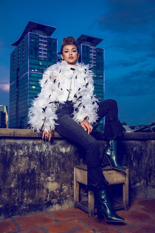 Quỳnh Mai thời trang đánh tan thời tiết là đây, để có được những shoot hình thời trang đẹp mê ly cô không ngại nóng để diện chiếc áo lông vũ khá đồ sộ.