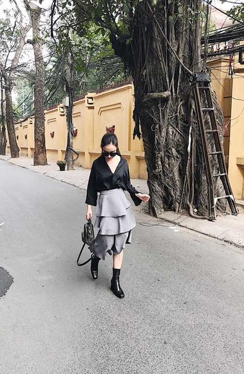Fashion icon Ngô Thùy Trâm diện áo thun đen với trend giấu quần. Đây là một trong những item có sức sống lâu bền trong đời sống thời trang của mỗi người, mà “cứ đến hẹn lại lên”.