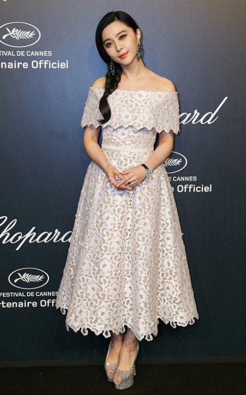 Chiếc đầm ren trễ vai với phần đô dài đã giúp Phạm Băng Băng giấu khéo léo phần bắp tay to mà vẫn vô cùng quyến rũ.