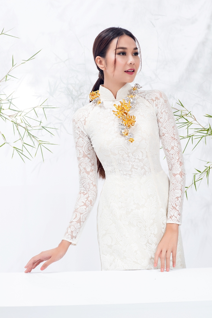 Trong một chiếc áo dài chất liệu ren với họa tiết hoa cúc, Thanh Hằng khéo léo kết hợp đồng bộ phụ kiện vòng cổ cũng được chế tác tương tự hình ảnh những đóa cúc vàng rực rỡ.
