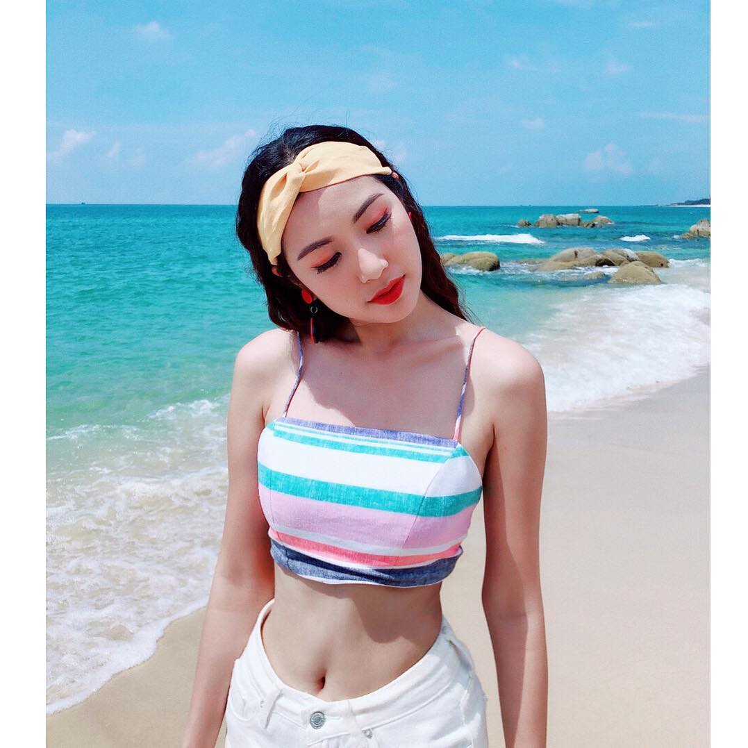Áo croptop cùng quần bơi đen cột dây là cách để Phương Ly khoe khéo đôi chân dài tít tắp cùng làn da trắng ngần.