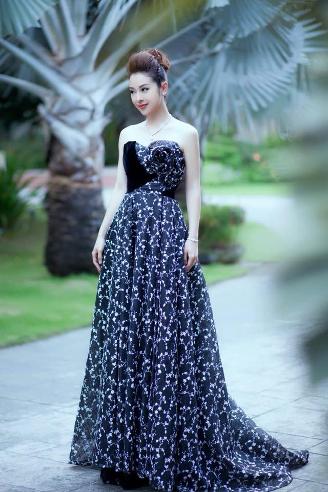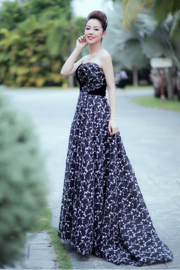 Thiết kế có kiểu dáng xòe, cúp ngực, màu sắc nhẹ nhàng làm nổi bật nhan sắc của bà mẹ trẻ. Nếu trong bộ cánh này Hoa hậu Jennifer Phạm được ca tụng với nhan sắc “không tuổi” vạn người mê. Thì Nhã Phương được ví như một nàng công chúa xinh đẹp trong một câu chuyện thần thoại.