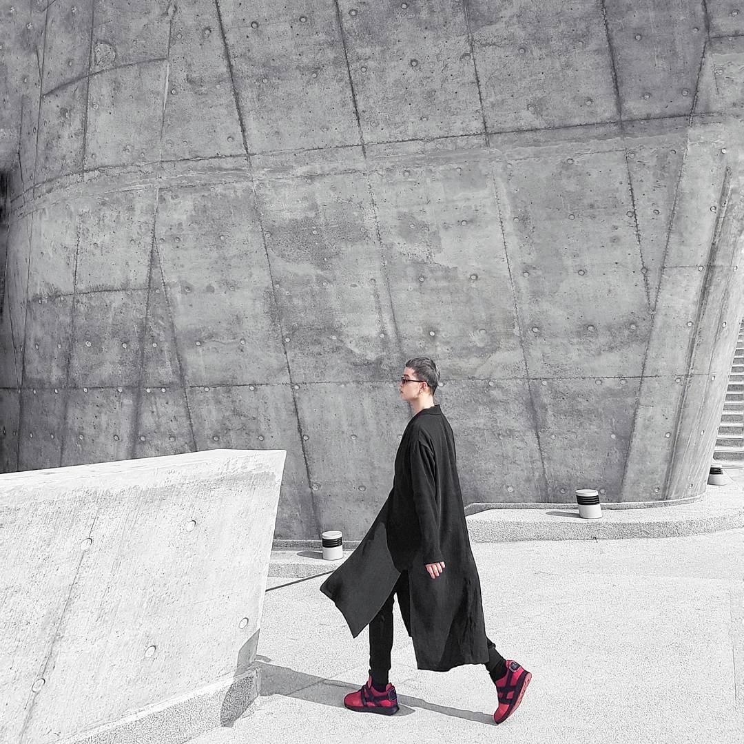 Kelbin Lei vô cùng nổi bật với áo dáng dài xẻ tà, phối cùng quần skinny đen và giày thể thao mang tông màu đỏ nổi bật.
