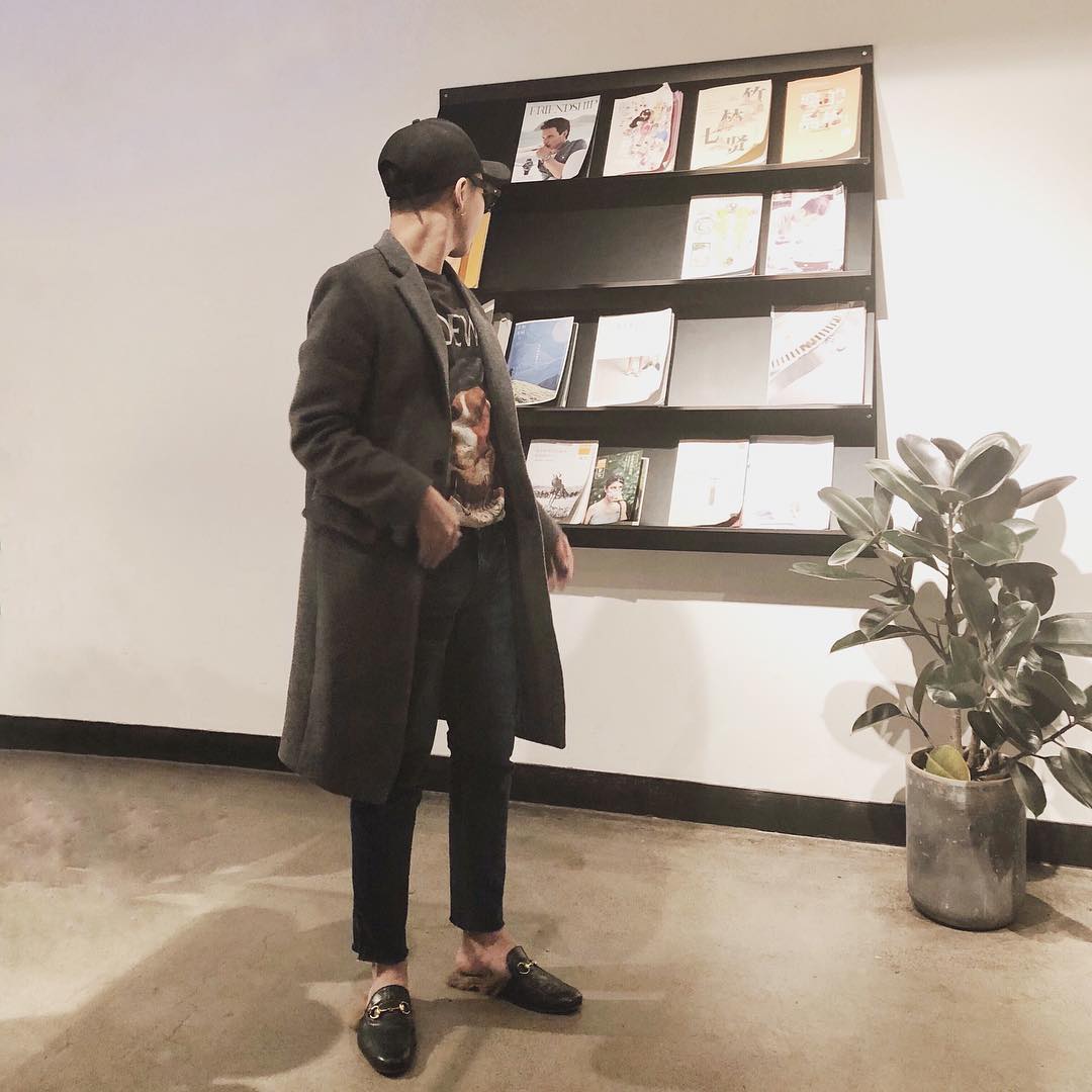 Stylist Hoàng Ku lựa chọn phối đôi loafer đính lông đắt giá của thương hiệu Gucci với áo khoác măng tô tông màu đất và quần ôm. Chàng stylist Hà Nội được nhiều tín đồ thời trang yêu thích bởi phong cách lịch lãm không bị trộn lẫn.
