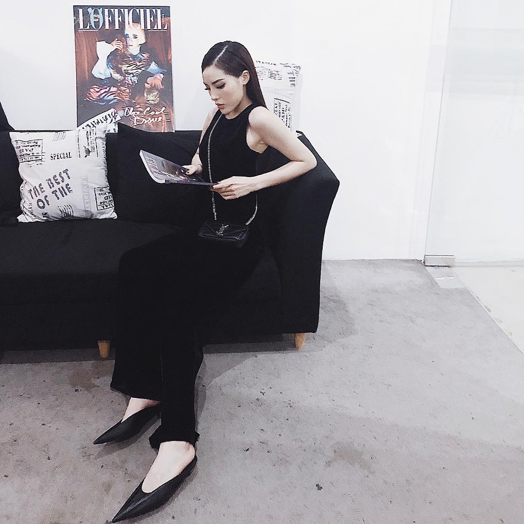 Kỳ Duyên khiến người đối diện không thể rời mắt với set đồ all-blacks ấn tượng. Không cần quá cầu kỳ, chỉ cần diện áo 3 lỗ trơn cùng quần ống đứng, phối với đôi giày mũi nhọn cổ chữ V hot nhất 2018, Hoa hậu Việt Nam 2015 đã cực kì nổi bật.