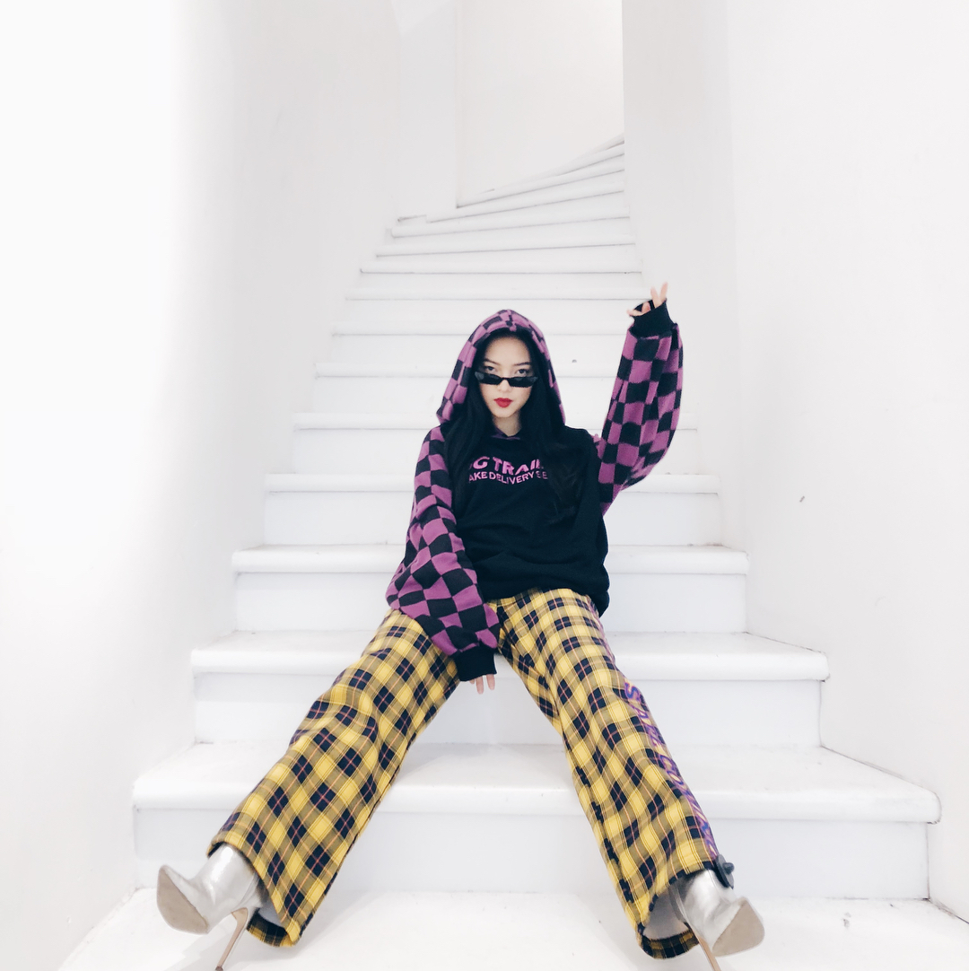 Quả xứng danh là một trong những fashionista được giới trẻ đánh giá cao, Châu Bùi đem đến set đồ gồm áo hodie và quần suông với họa tiết ca-rô đang cực “hot”. Cái hay của cô nàng là lựa chọn cả cây trang phục họa tiết và màu sắc có phần nổi bật nhưng lại vô cùng hài hòa, không bị “làm quá”.