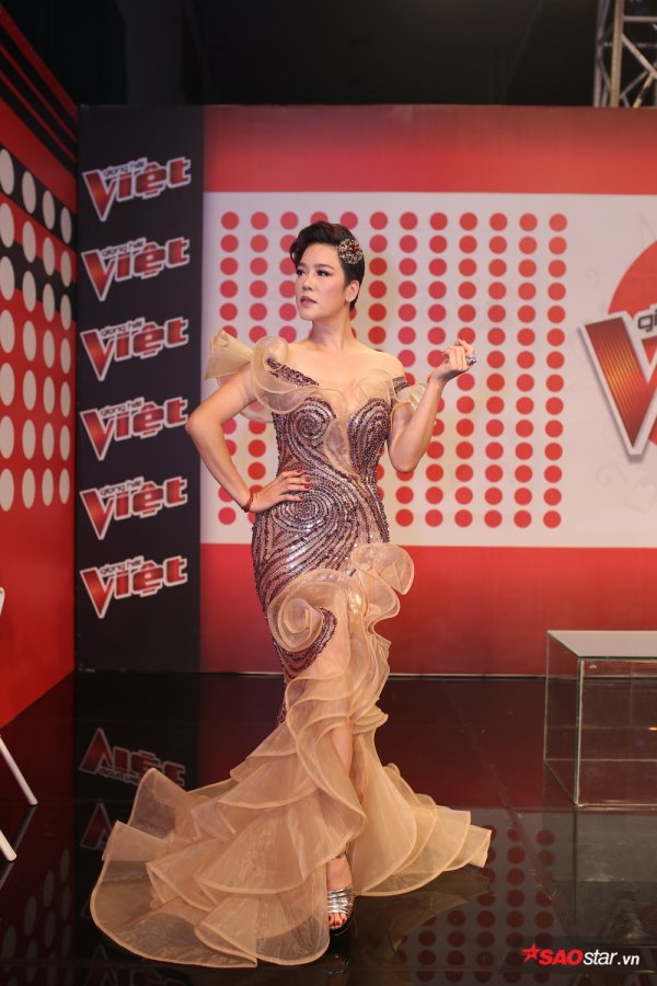 Trong tiết mục mở màn, HLV Thu Phương khoe dáng vẻ yêu kiều trong chiếc váy ôm sát đính bèo hoa chạy dọc thân.