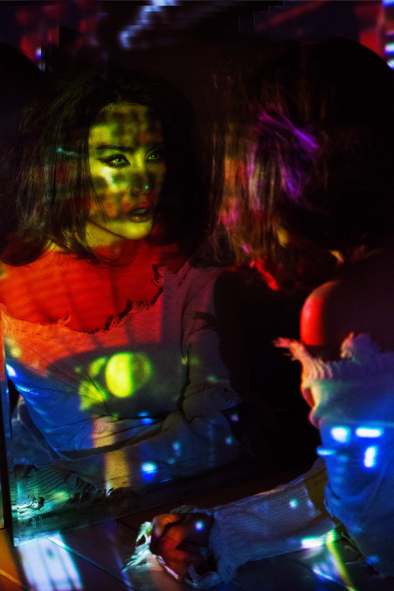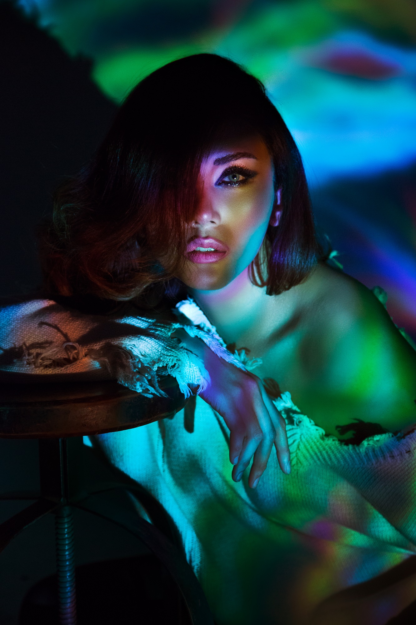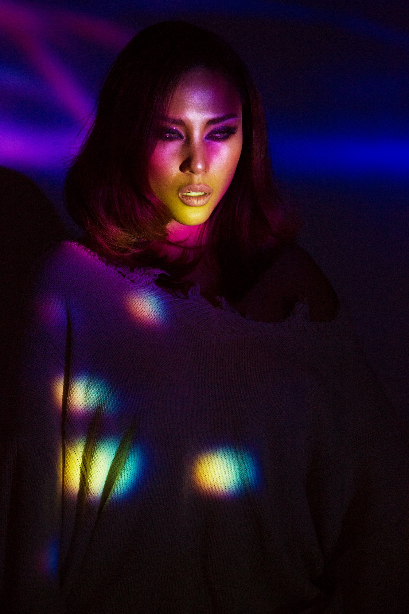 Điều thú vị ở bộ hình này đó chính là ánh sáng, không phải những ánh đèn thông thường khi chụp trong studio mà đó là những ánh sáng do máy chiếu tạo ra.