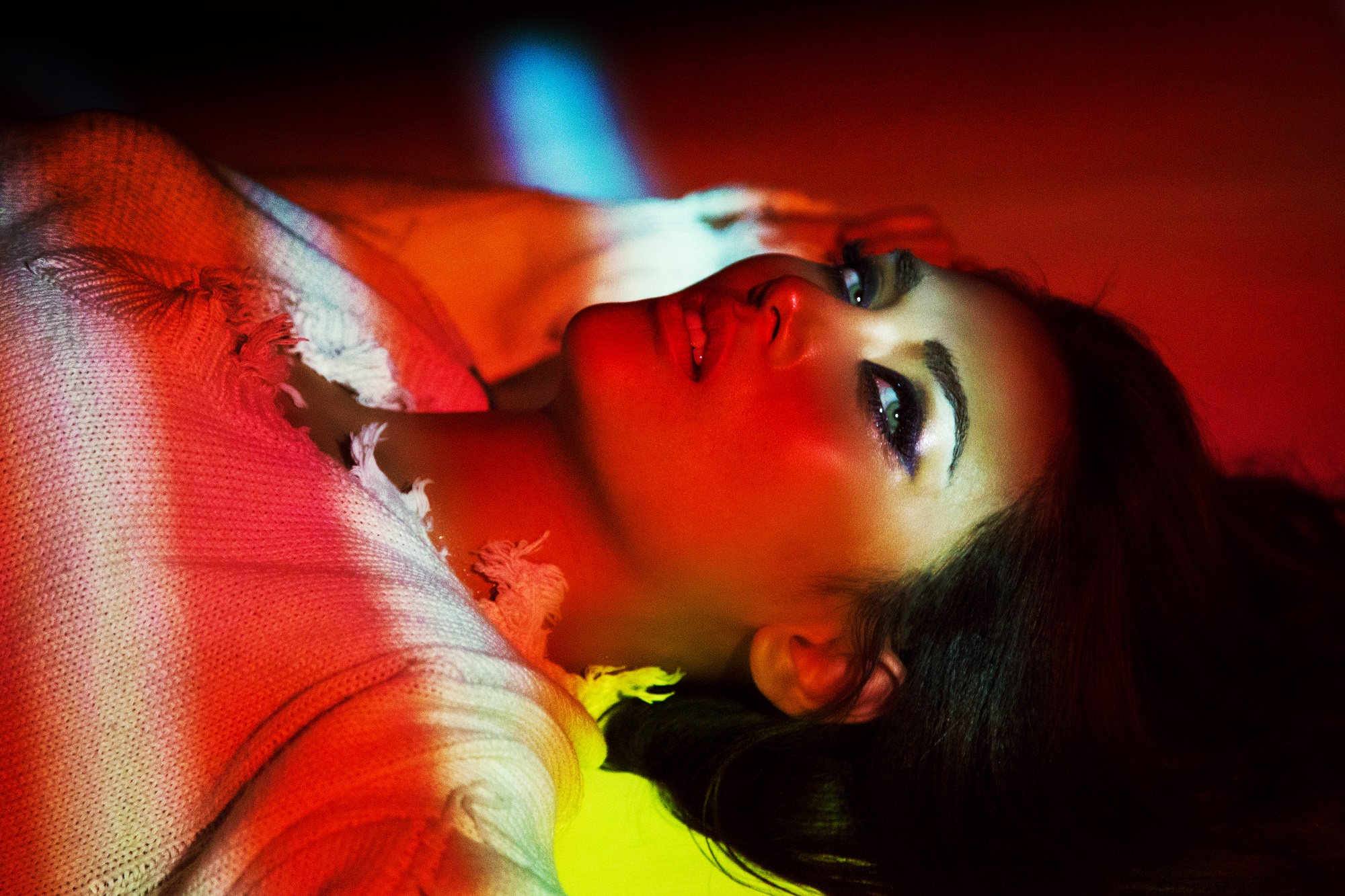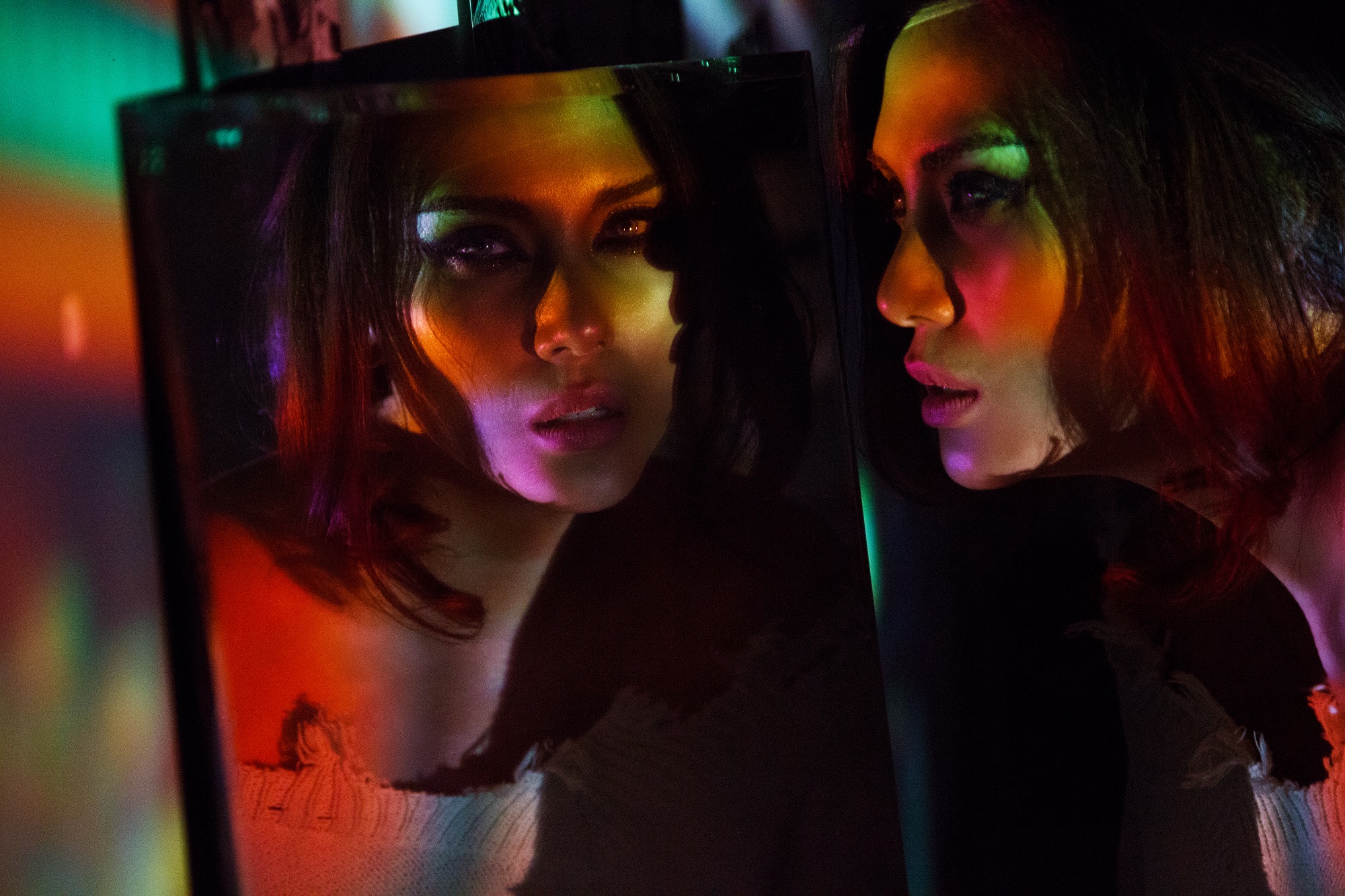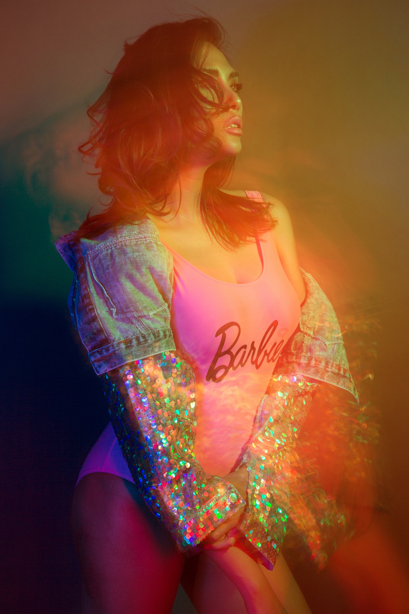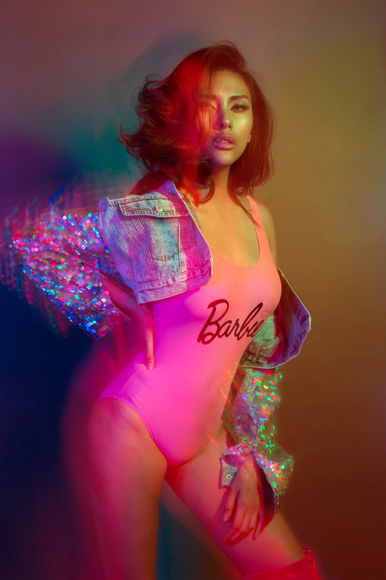 Điều thú vị ở bộ hình này đó chính là ánh sáng, không phải những ánh đèn thông thường khi chụp trong studio mà đó là những ánh sáng do máy chiếu tạo ra.