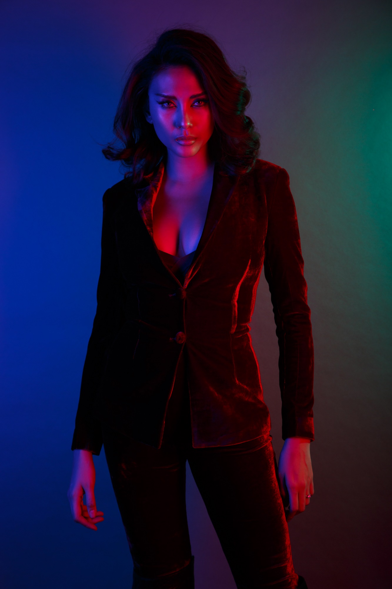 Trong bộ vest nhung, siêu mẫu đã khéo léo khoe vòng một đầy gợi cảm của mình. Kết hợp cùng layout makeup ấn tượng và lối diễn xuất chuyên nghiệp.