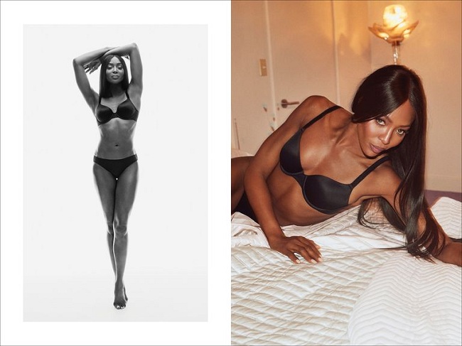 Siêu mẫu Naomi Campbell thả dảng lả lơi trên giường trong bộ đồ lót của Calvin Klein