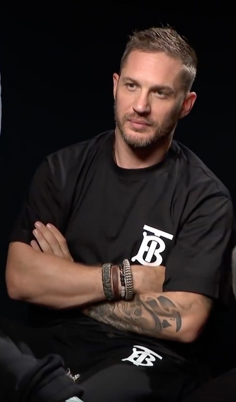Nam diễn viên Tom Hardy phong trần và mạnh mẽ cùng chiếc áo đơn giản với logo.