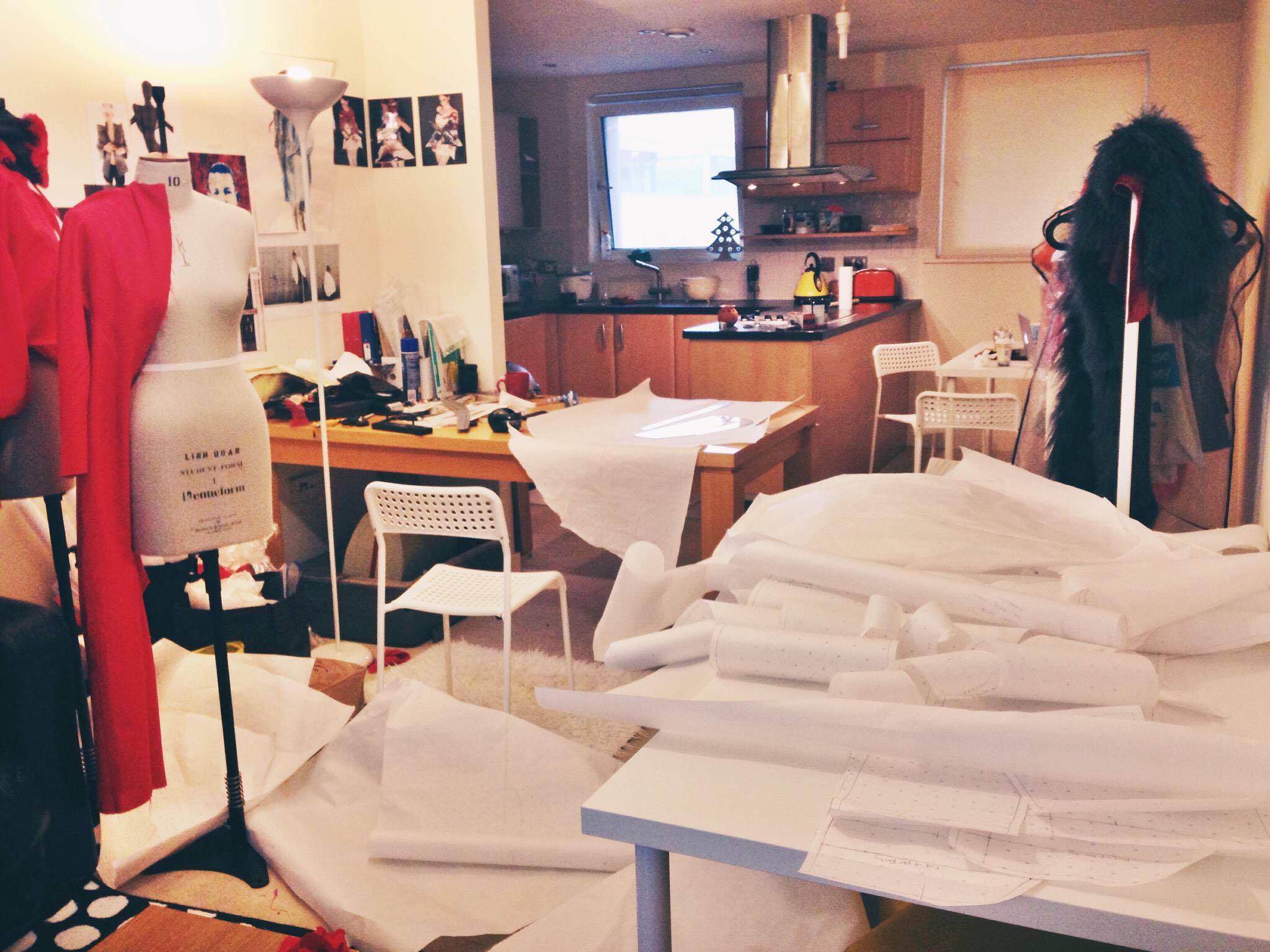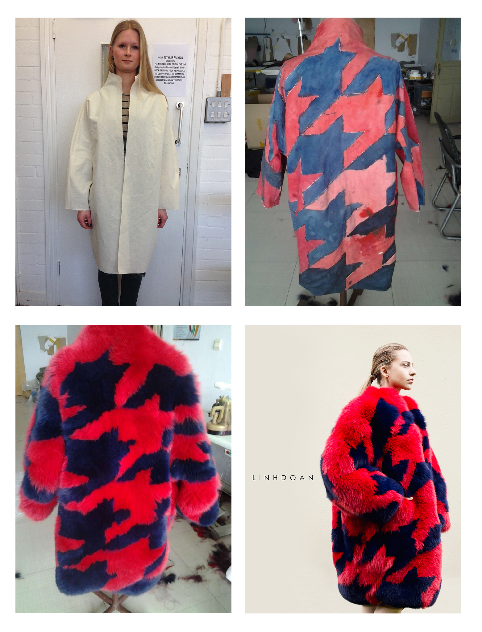 NTK trẻ đã vô cùng hào hứng khi được đề nghị chia sẻ lại quá trình thực hiện sản phẩm này. Đây cũng là lần đầu tiên Linh kể về chiếc áo khoác sau hàng loạt những bình luận và sự chú ý của cư dân mạng gần đây. Đầu tiên, Linh đã phải mất 1 tháng để có thể lên phom áo trến giấy cũng như sử dụng kĩ năng toán học để có thể chia tỉ lệ của 62 mảnh ghép để tạo ra được hoạ tiết houndstooth sao cho chính xác và cân đối nhất vì chỉ cần lệch một ly thì chiếc áo sẽ hỏng ngay. Cùng với đó Linh đã mất rất nhiều ngày tiếp theo để có thể tìm ra được một chất liệu ưng ý. Chính vì vậy, đối với Linh thì chiếc áo lông này đại diện cho lòng nhiệt huyết cũng như sự sáng tạo, tính logic trong mọi công việc và khi nhìn vào nó Linh có thêm nguồn động lực để làm nên những bộ sưu tập tiếp theo.