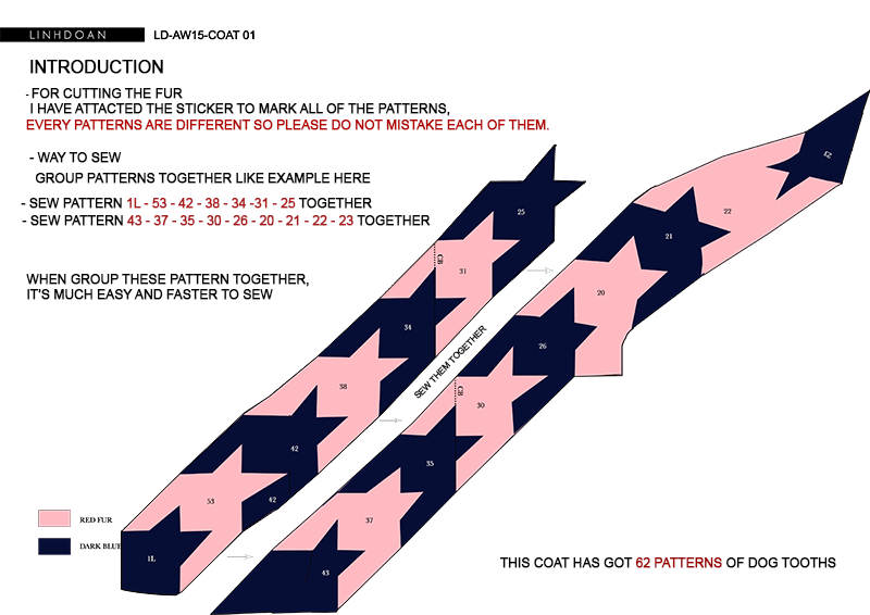 Chiếc áo lông được tạo bởi 62 mảnh lông hoàn toàn khác nhau để ghép nên chiếc áo hoàn chỉnh, liên kết với nhau.