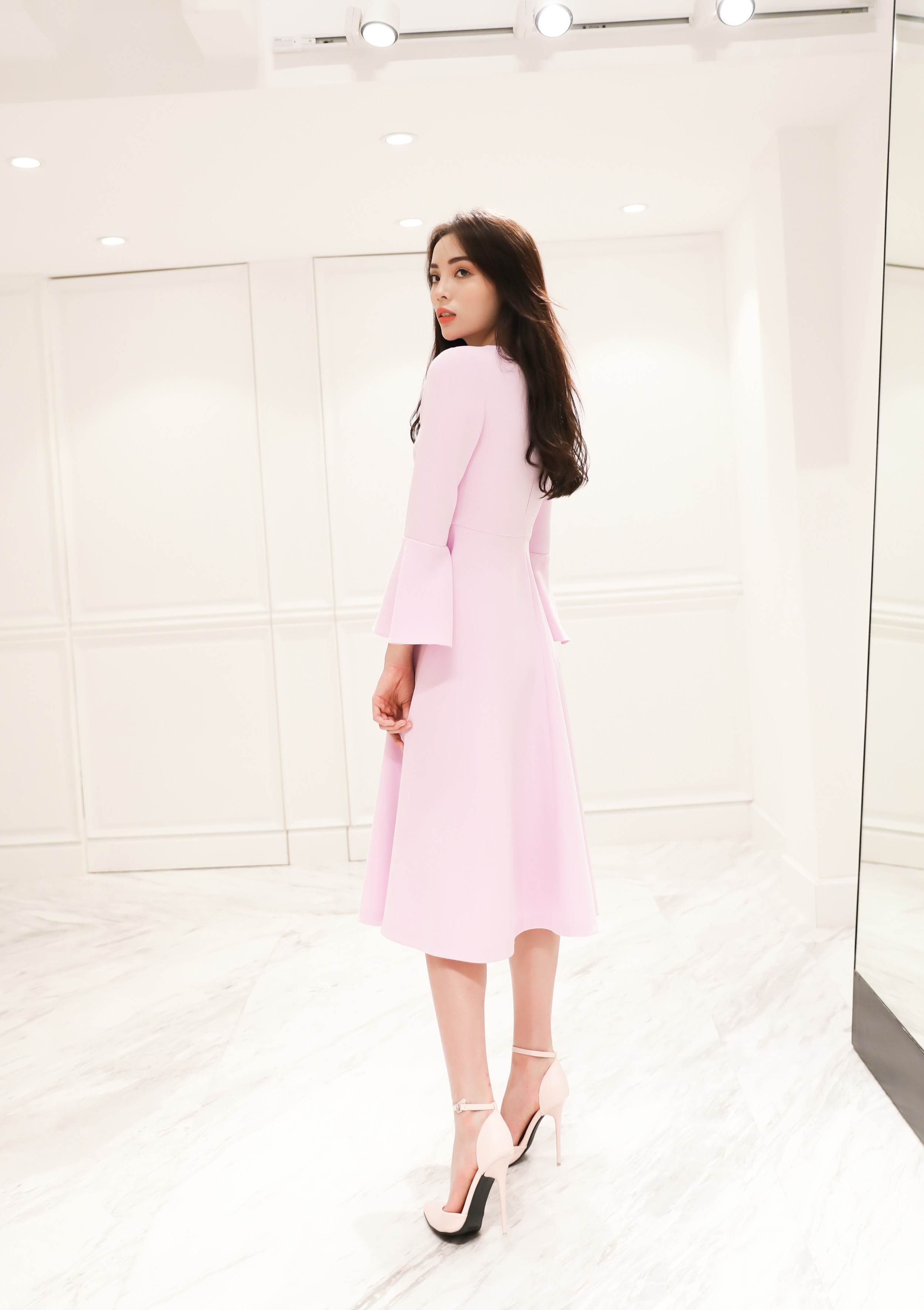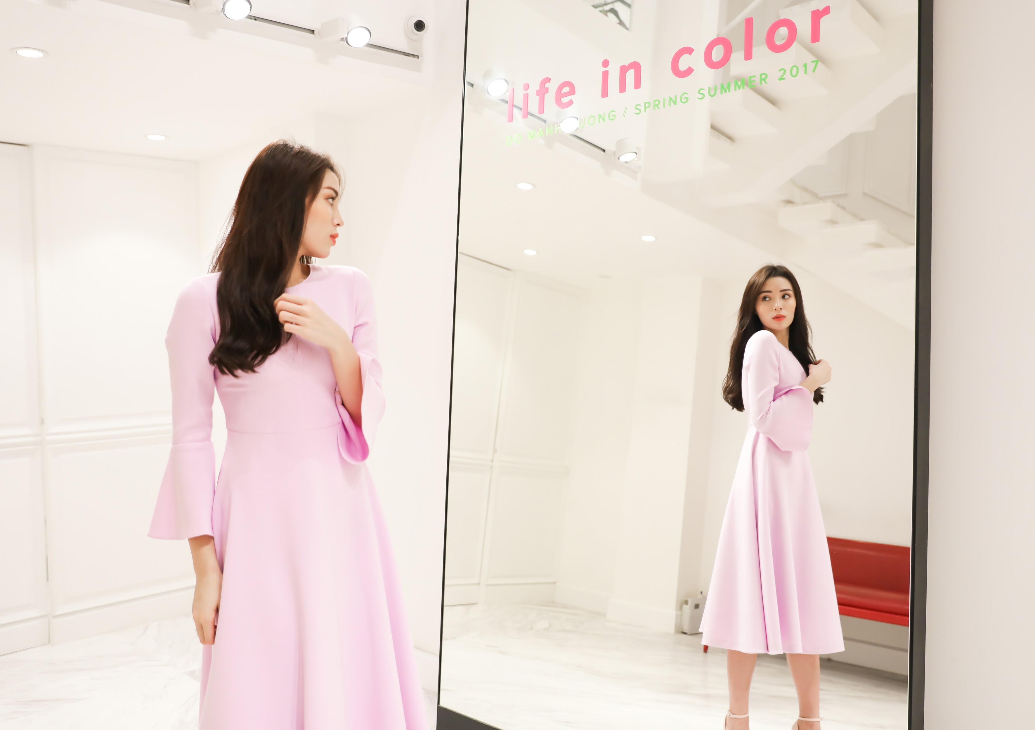 Thiết kế đầu tiên của Kỳ Duyên có tông hồng pastel ngọt ngào với phom xoè cổ điển.