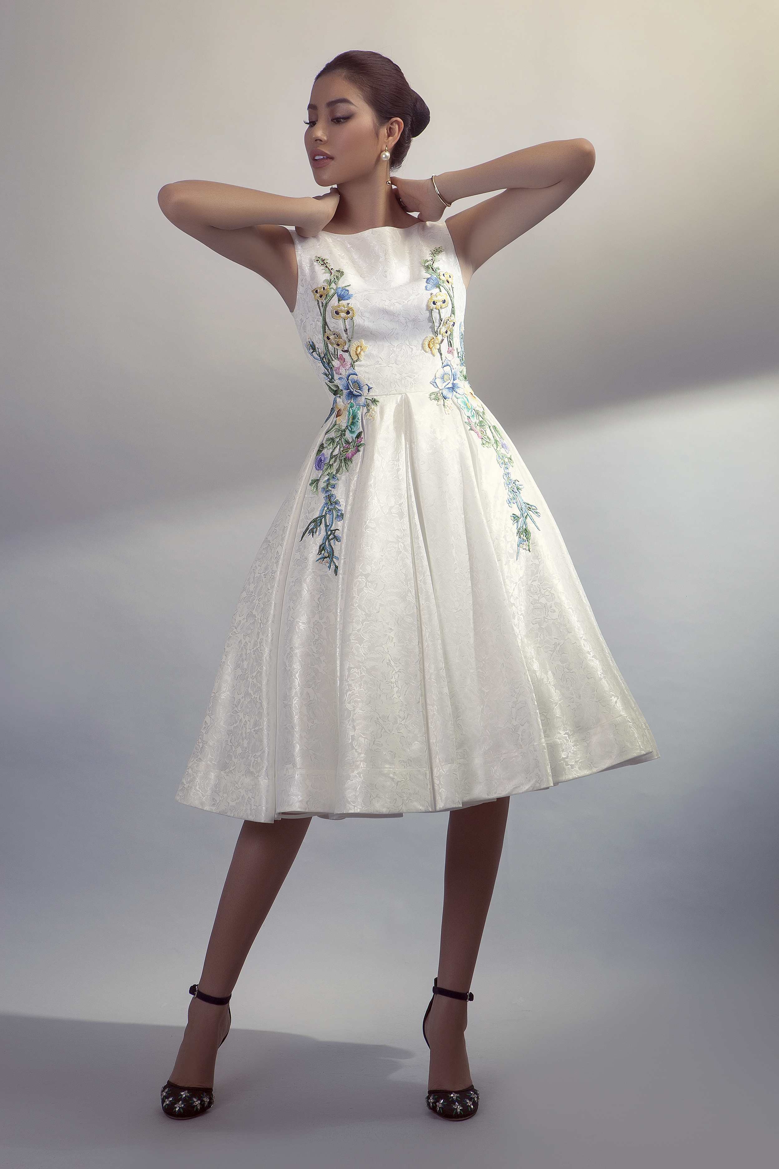 Trong một thiết kế khác, những chi tiết hoa thêu 3D được sắp xếp ngẫu hứng & đối xứng, tạo chất cảm cao cấp & khác biệt cho một thiết kế đầm xòe khá đơn giản may bằng chất liệu Taffeta sang trọng.