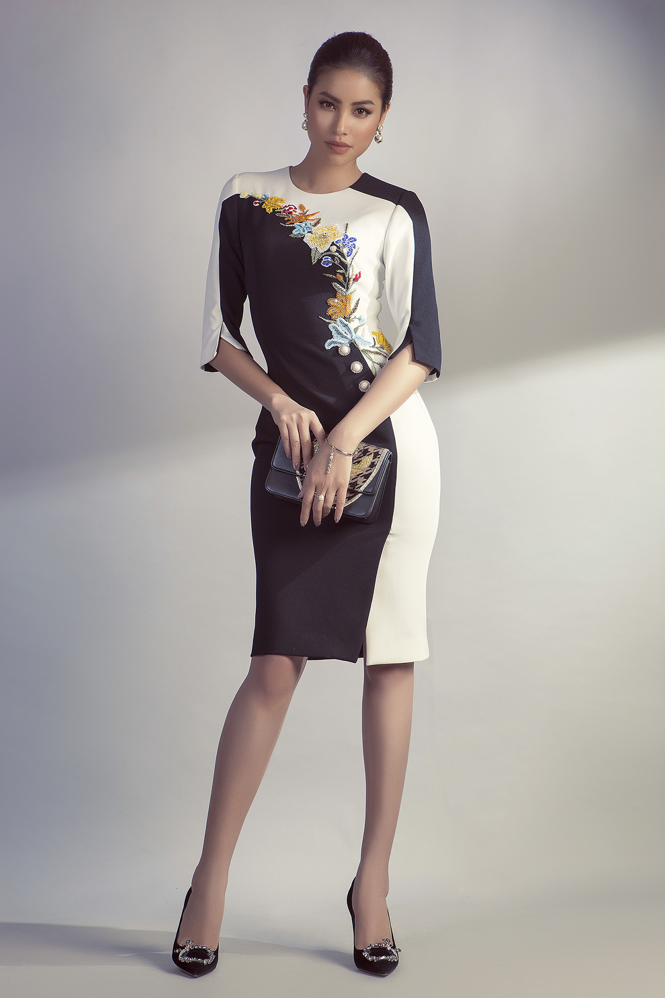 Trên nền tảng chiếc đầm bút chì tay lỡ đơn giản & quen thuộc, NTK đặt để những mảng màu đen trắng tương phản với kĩ thuật cắt ráp vải điêu luyện, tạo thành đường cong uốn lượn hút mắt, điểm xuyết thêm những bông hoa càng tăng thêm phần nữ tính & duyên dáng cho người mặc.